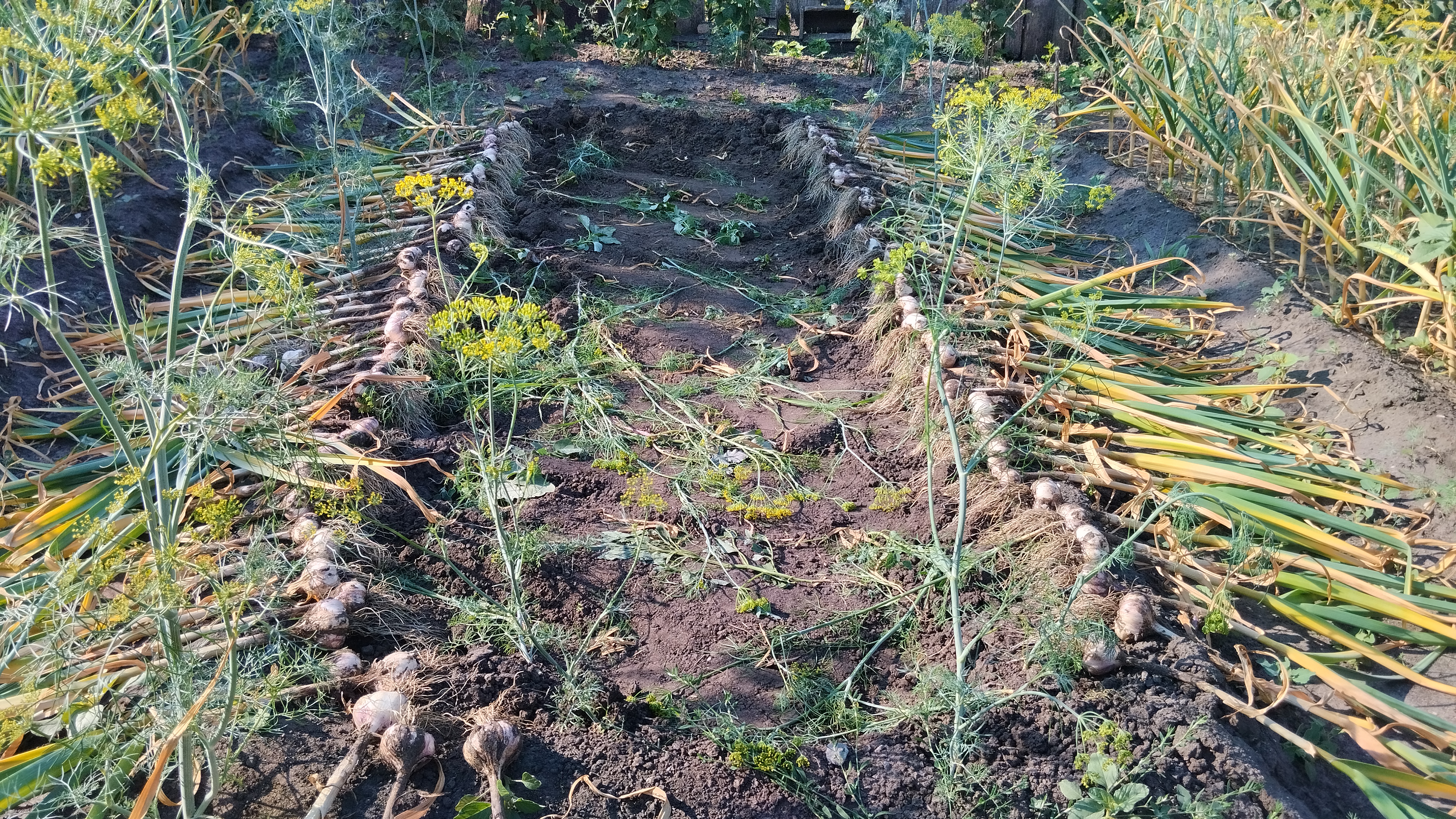 начал уборку чеснока, вчера треснула оболочка на контрольных бульбочках.нынче на недельку пораньше дошел чем в том году.