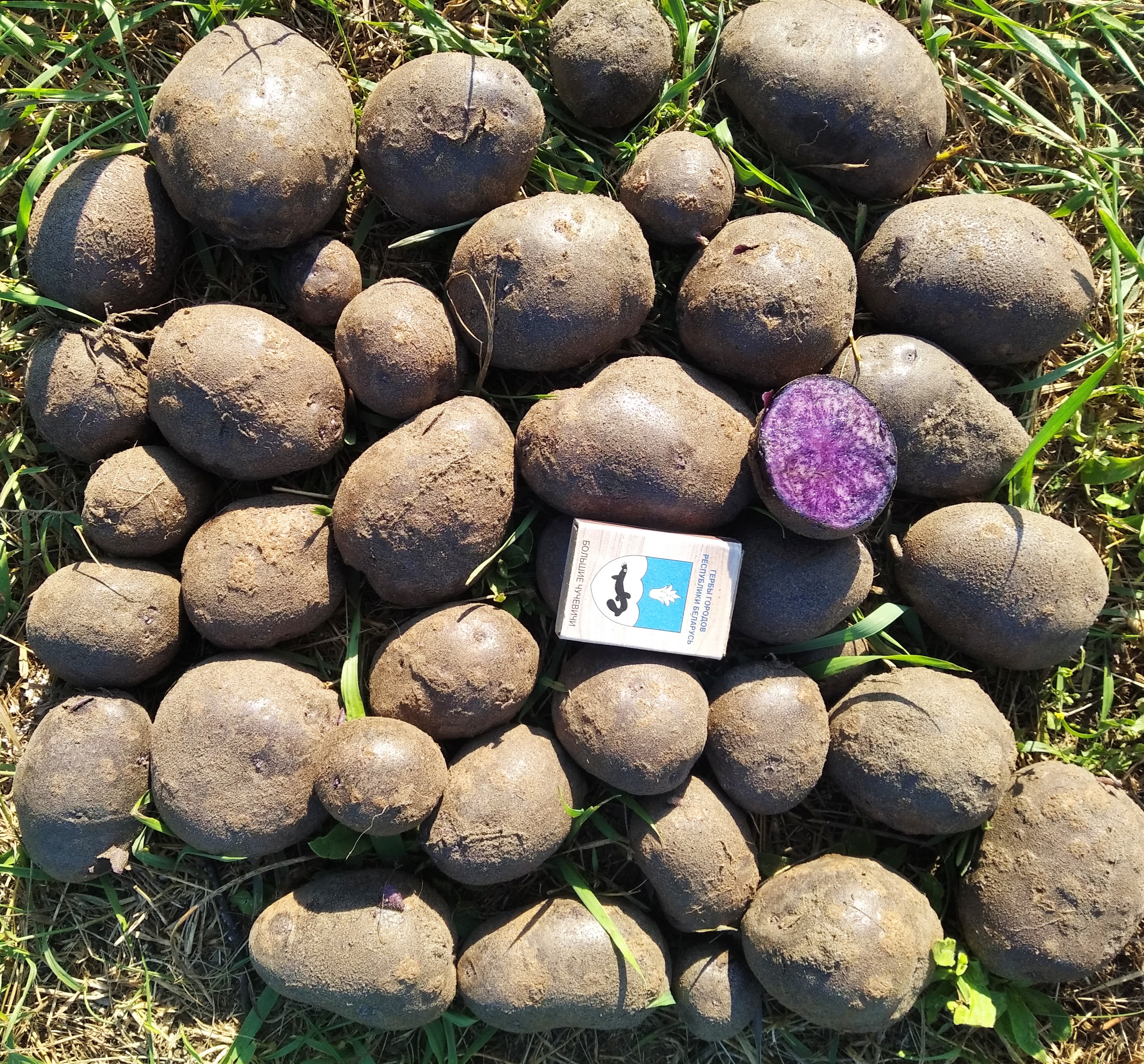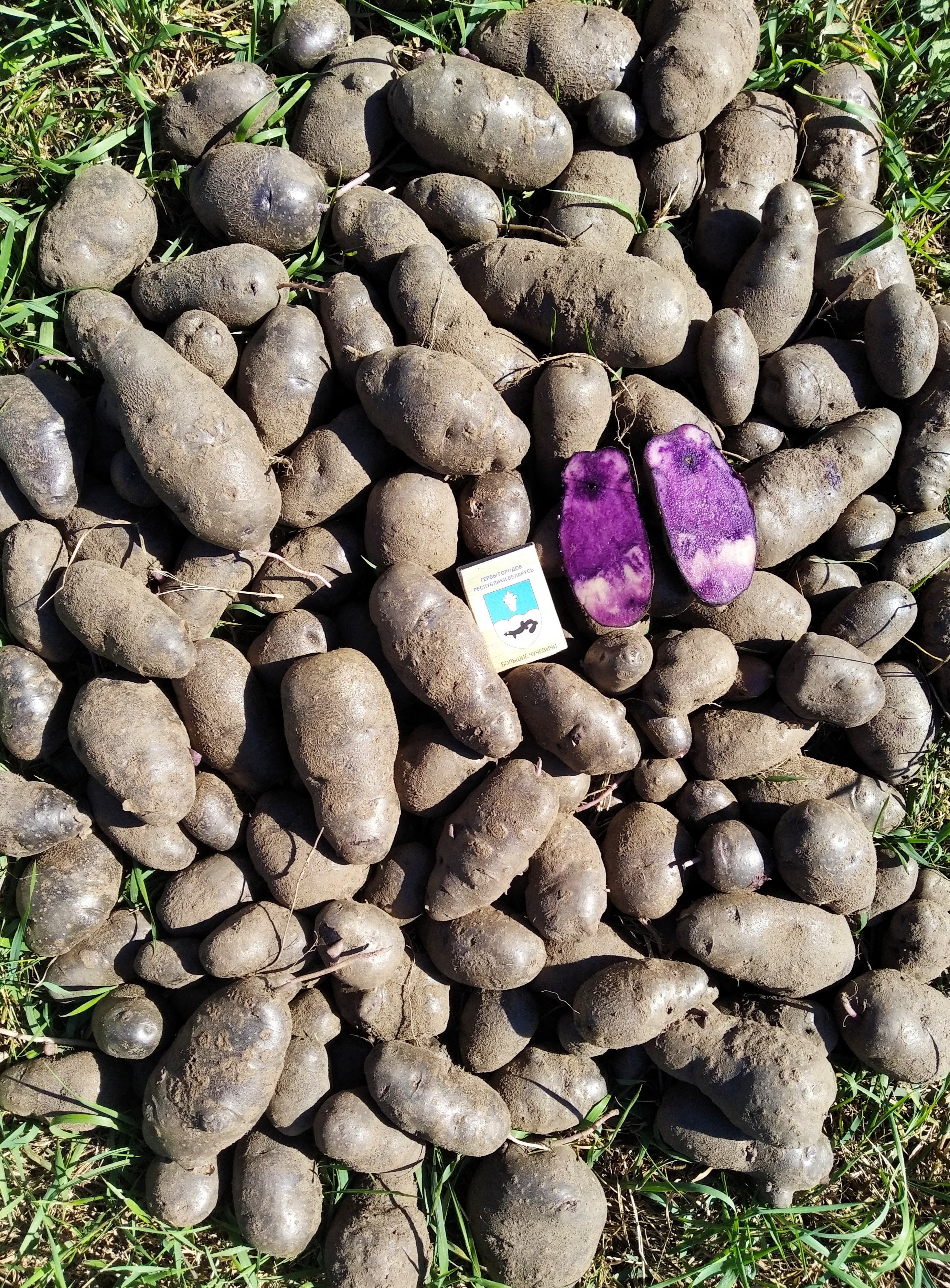 Третий синий сорт- приобретался как Дикий синий родом из Южной Америки. В прошлом году урожай был никакой- по три горошины на кусте. Дала ему второй шанс, посадила на хорошо удобренной земле и даже поливала. В этот раз урожай удивил- копать было очень приятно- клубни крупные, шарообразные, одного калибра, мелочи мало. Количество среднее, но такой отдачи от него я даже не предполагала. На вкус еще не пробовала.