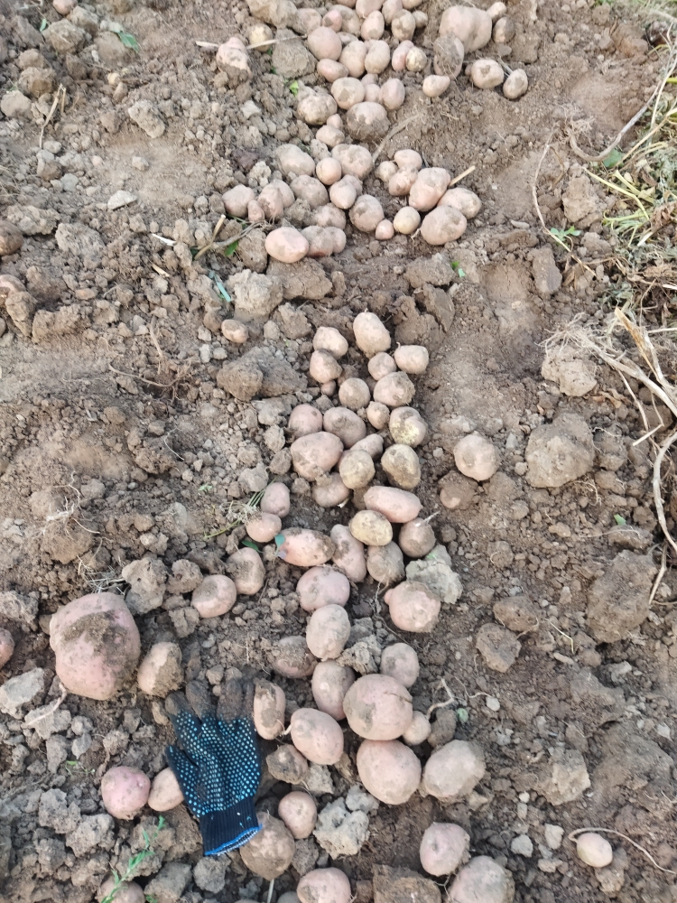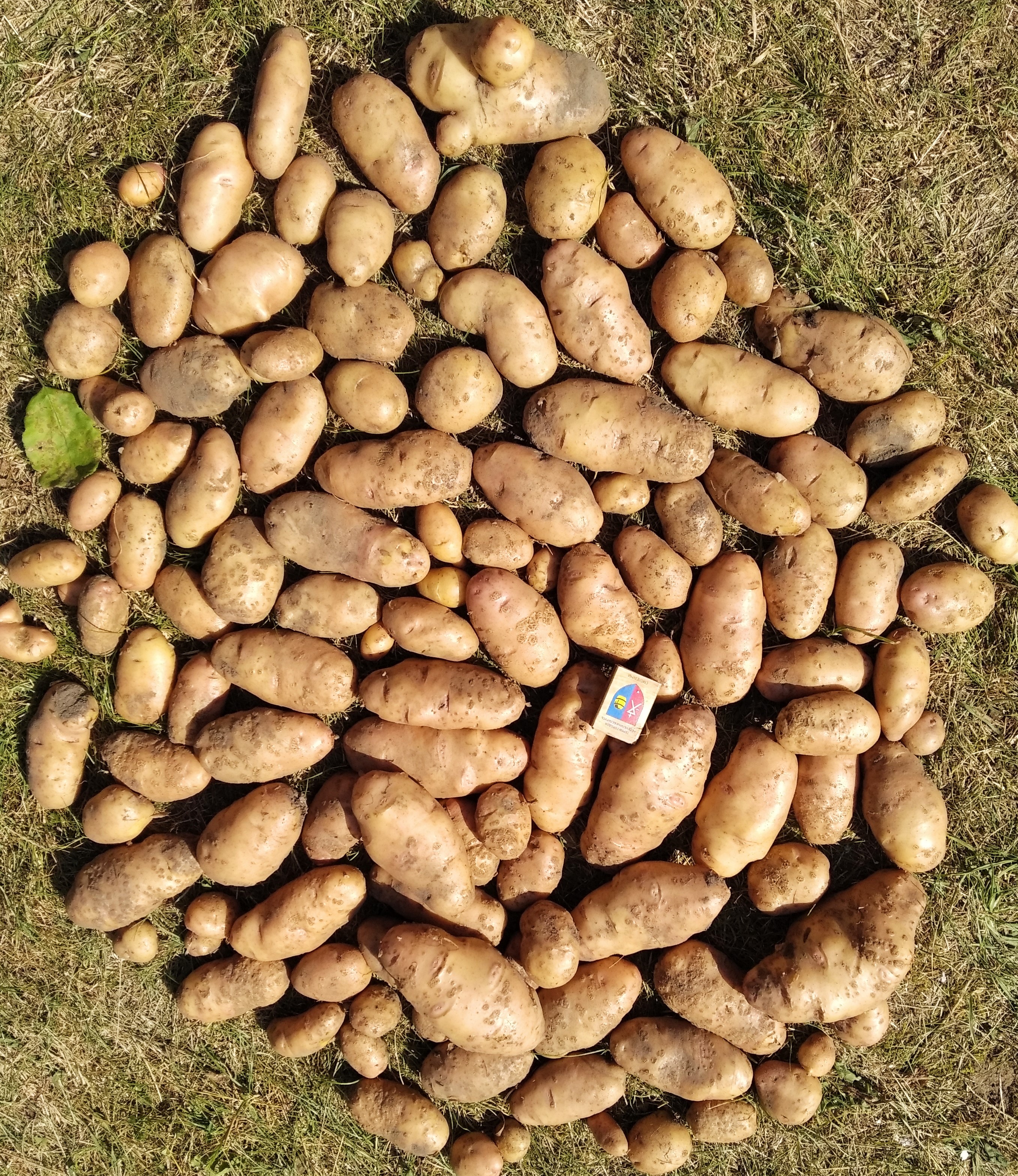 Манифест. Очень неровный в этом году, есть хорошие кусты с гладкими крупными клубнями( там где земля рассыпчатая), но и много заболевших с бляшками и легкой плесенью, холодное и сырое начало лета спровоцировало ризектониоз, неустойчив сорт к нему. Пока на 60 кустов 4,5 ведра, но остался "волшебный угол", где в прошлый год Скарб зеленел до заморозков при высохшем остальном поле, так и сейчас Манифест там зеленый.