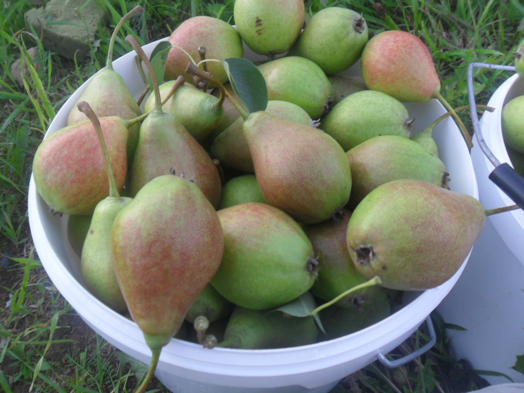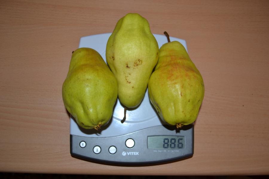 Плоды все крупные, на данный момент очень вкусные (на мой вкус), мякоть скалывающаяся, нежная, сочная, чуть маслянистая, сладковатая с преобладанием сахара без грануляций. Есть приятно, можно сразу несколько съесть - вкус южной груши. Полностью желтые груши уже не представляют особого вкуса, обычная пресная каша, поедать надо чуть начинающие желтеть.
