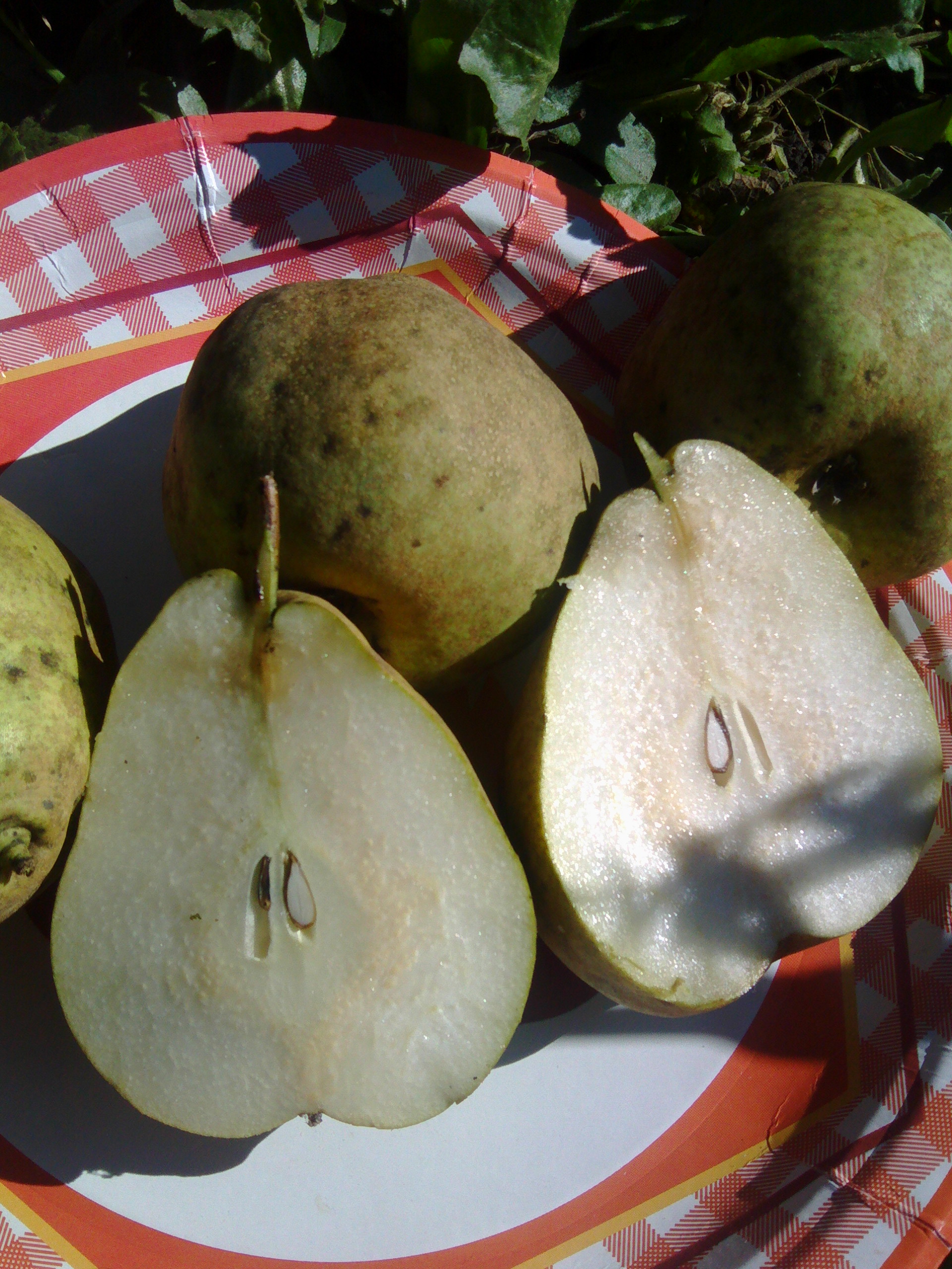 Проезжал мимо старого дерева БЗМ,с которого далёкой осенью 2012 срезал черенок и привил в ЦП Тихого дона,сорвал снизу небольшую грушку.Дней десять болталась в машине,сегодня такая.Была ярко зелёной,слегка пожелтела.Мои уже яркожёлтые (фото на выходных). Это в середине сентября,перед уборкой у меня.В чём сходство-пресловутый пятигранник в разрезе поперечном,знак качества. Свежесобранные.