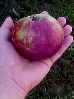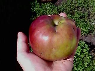 Сдается мне, что вместо энтерпрайза мне подсунули Памяти ульянищева (Сам сорт памяти ульянищева у меня тоже должен был быть, но ветка с яблоками обломилась еще в июне). Яблоки в основном очень крупные, где-то за 300 гр точно, очень сочные, хрустящие, при полном созревании ощущается оригинальный аромат, наподобие розы. Вкус отличный, но...