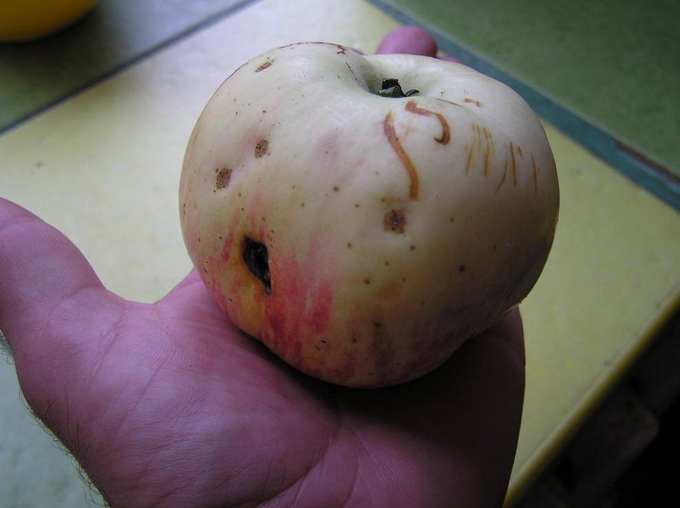 Т.е. в итоге из всего большого сада, всего одна яблоня оказалась плодами имеющими хороший вкус. Вероятно это оценила и плодожорка. Так как найти в прошлом году целого яблока мне не удалось. Ниже я покажу фото плодов этой формы.
