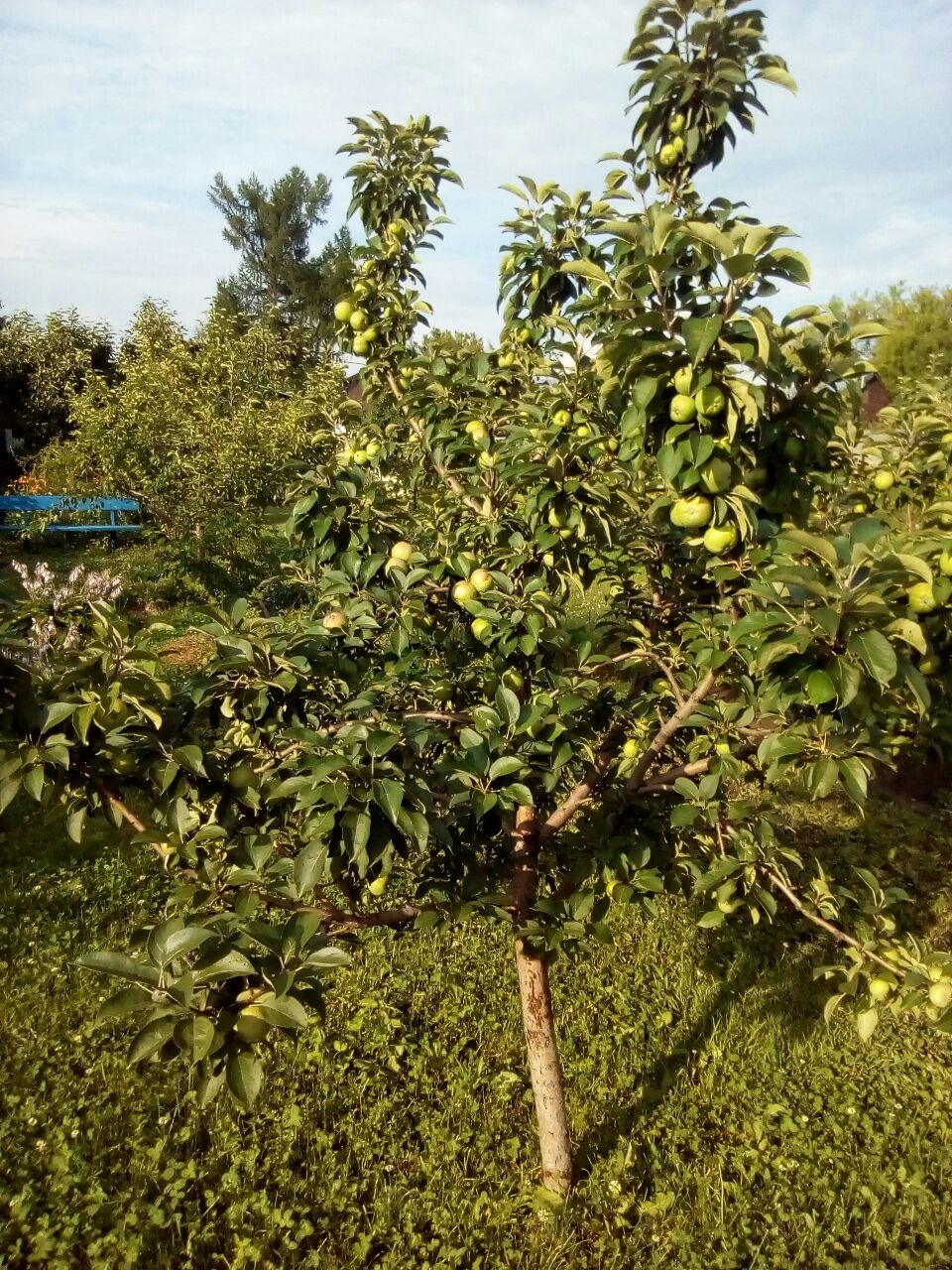 Как видно на фотографии, ствол дерева получил небольшой наклон, но, благодаря залужению, в опоре не нуждается, выдерживает даже сильные ветра. Подпорки для веток используются только при сохранении урожая. Плодоношение стало строго периодичным, по четным годам. В прошлый раз собрал более трех ведер, в этот раз ожидаю примерно столько же. Без профилактических обработок сорт может сильно поражаться паршой, поэтому им надо уделять серьезное внимание.
