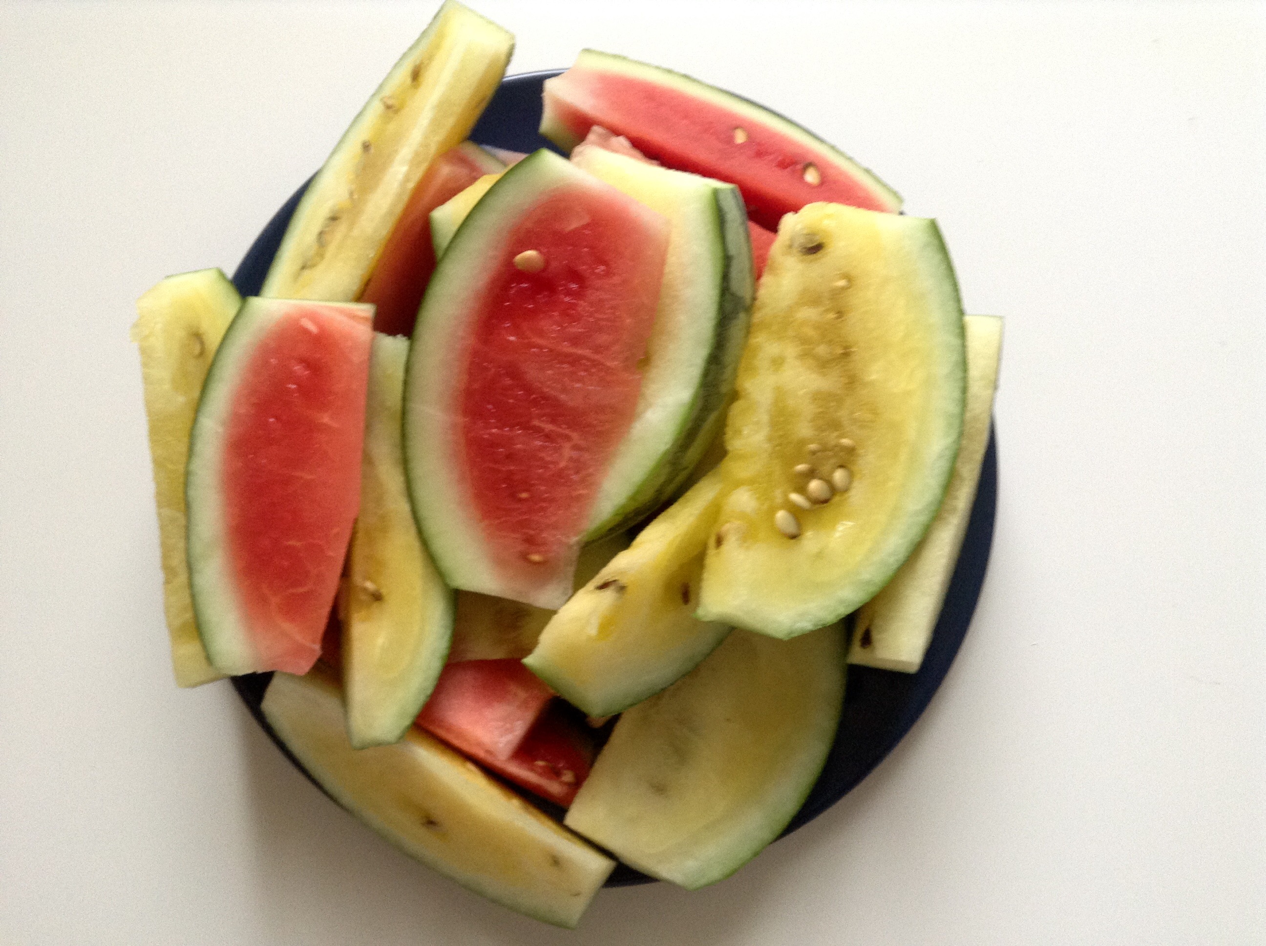 В 2013 году на Филиппинах (острове Бусуанга) купили небольшой длинный арбуз. Небольшой - чтобы съесть и ехать дальше :) Когда арбуз разрезали, он оказался не такой уж что б очень сладкий, но желтый и длинный - интересно. Я семечек немного сохранила. У меня тогда теплиц еще не было ни одной, а желание сажать ВСЕ уже было.