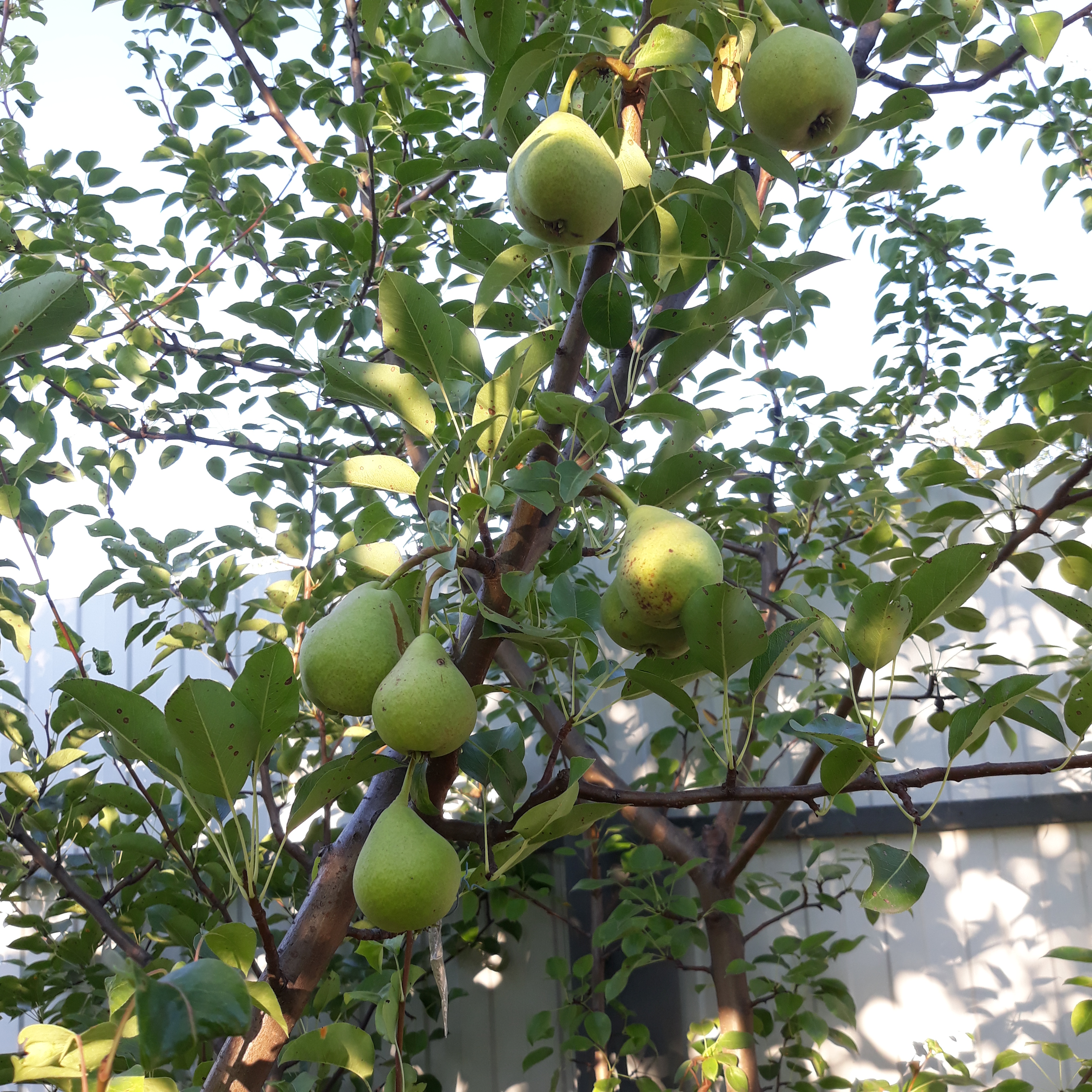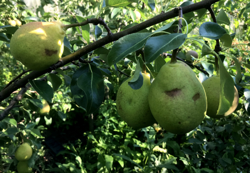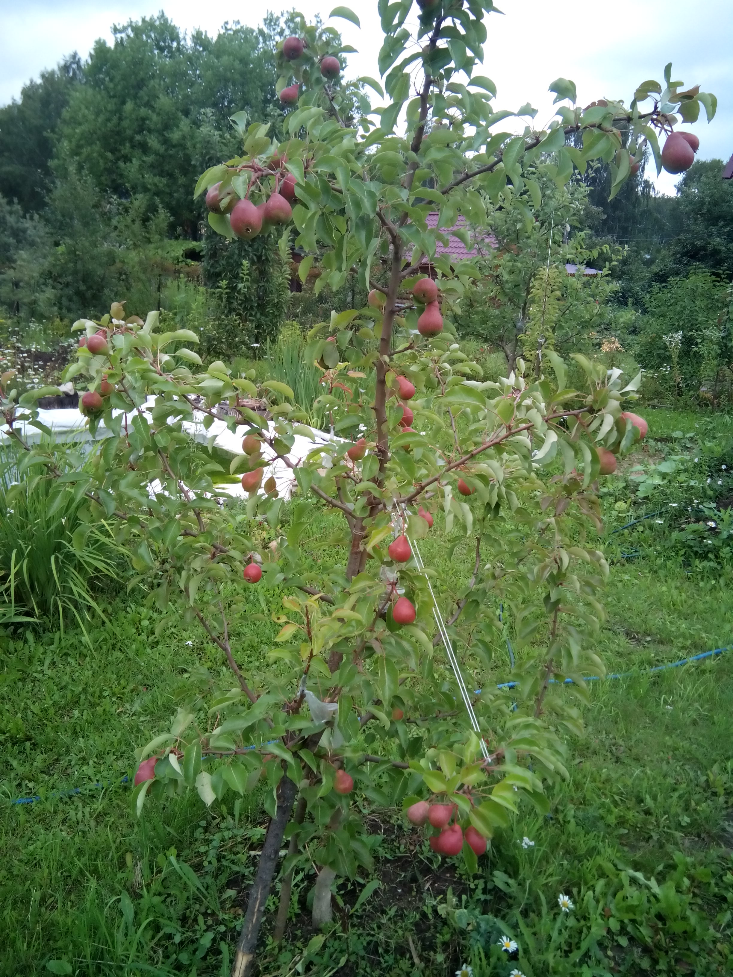 Груша Чижовская. Первое нормальное плодоношение, не считая сигналок прошлого года. Нормировки урожая не делала. Смотрю на фотки в интернете и не понимаю почему мои грушки такие румяные, в интернете больше зелёных с небольшим бочком красно-желтым. И листья немного красные, хотя это из года в год. Груша полностью целый день на солнце, может из-за этого?)