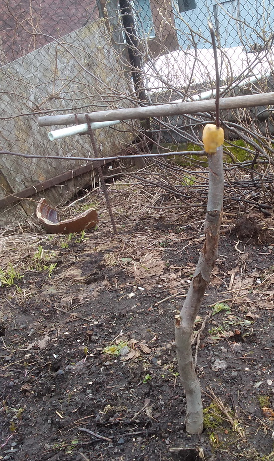 17 апреля сделала как смогла прививку. На сегодня сняла пакетик с неё, не понятно прижилась или нет. Надо ждать когда у нас потеплеет и начнут распускаться почки. Прививка вверх торчит. Это черенок яблони Сурхурай. Одна оставшаяся после слома родная ветка яблони Толунай торчит влево. Деревце сестры. Спросила у неё что с корой, она не знает.