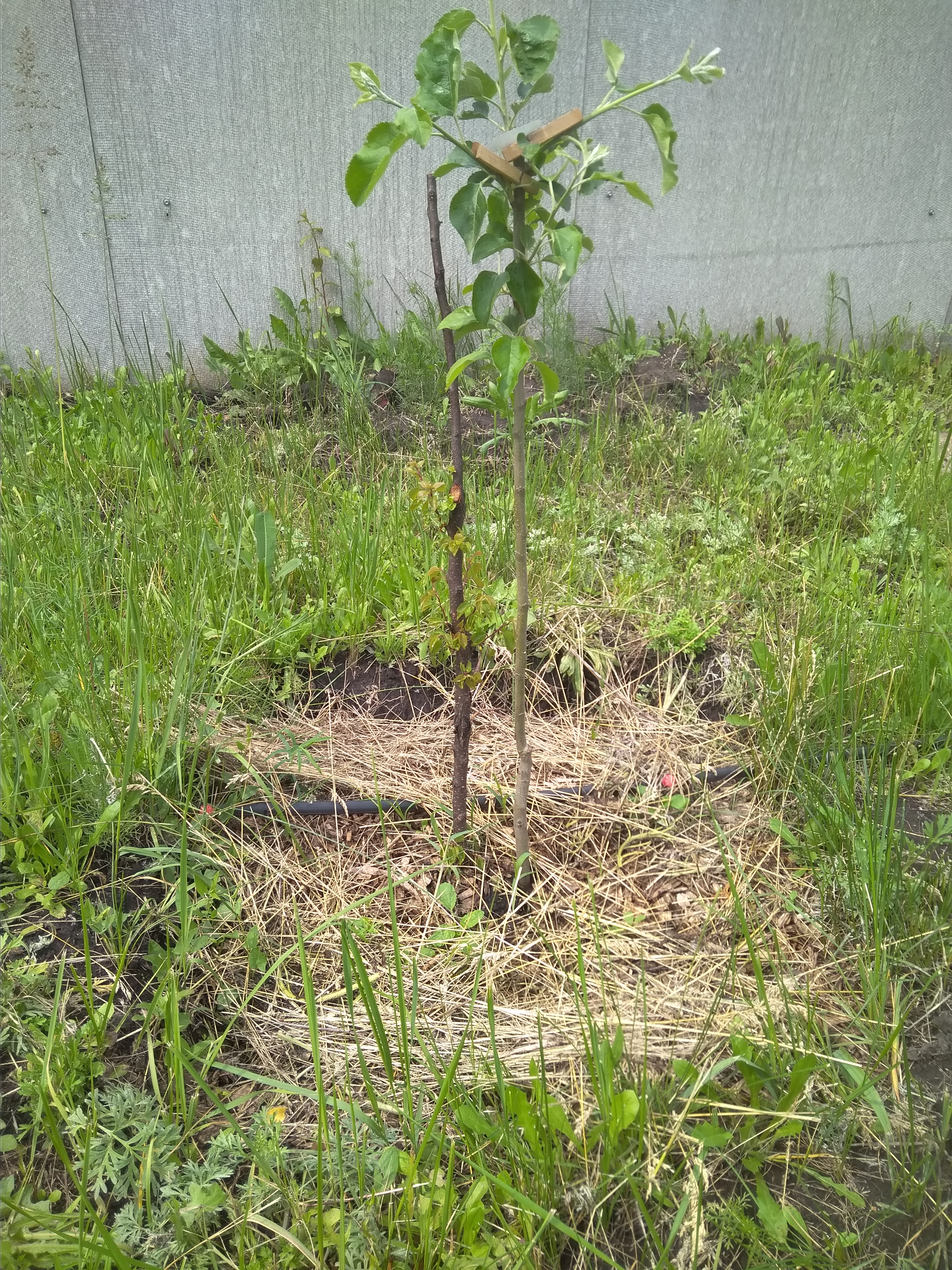 Сегодня ездил к дочери на участок. Там молодые саженцы этого года посадки. Вот один из них. Когда сажал в марте, для будущей опоры срезал ветку жердели. Интересно, что быстрее вырастет?