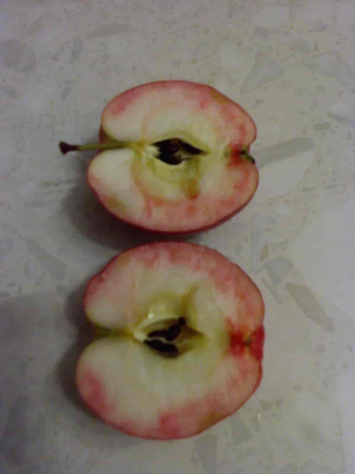 У меня этот сорт аналогично ведёт себя как у Энди - один в один. Очень урожайный. Второй раз за несколько лет разламывало большие суки от излишней нагрузки. В этом году сломало макушку - центральный проводник и ещё большой сук сверху - помогли сильные ветра. Если снизу я смог поставить подпорки, то сверху, тем более центральный проводник зафиксировать не смог. Высота яблони около 5 метров. Правда, мякоть в этом году не так интенсивно окрасилась как в обычные годы. Сказалась холодная погода в апреле -июле включительно. Из-за этих холодов и отсутствия солнца нынче все яблоки и груши не добрали сахара и не так интенсивно окрасились. Даже конфетное стало опадать полусладкое и с травянистым привкусом. Одним словом этот год, пожалуй, самый неблагополучный. А из-за обилия дождей парша и гниль вообще били рекорды. А химии не хотелось применять, а пришлось. Но эффективность её применения мизерная. Дожди шли очень часто и почти всё смывало. А Афродитой я доволен и всем рекомендую. Отличный сорт.Энди Таккер писал(а): Теперь уже совершенно достоверно можно полагать, что нынешнее лето с успехом продолжило дело минувшей зимы по выявлению надежных и безпроблемных сортов. В моей коллекции чемпионом сезона вновь стал сорт Афродита. Отлично перезимовал, дал обильную завязь и хороший налив. Даже слишком хороший - пара веток уже в начале сентября сломалась из-за недостаточной нормировки завязей. Интересной особенностью сезона стал окрас плодов. Наружный окрас почти "классический" (обычно в моих условиях получается более яркий), зато окрас мякоти получился совсем как у настоящего красномясого сорта: Можно сказать, краснота "перекочевала" внутрь плодов.![]()