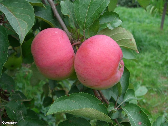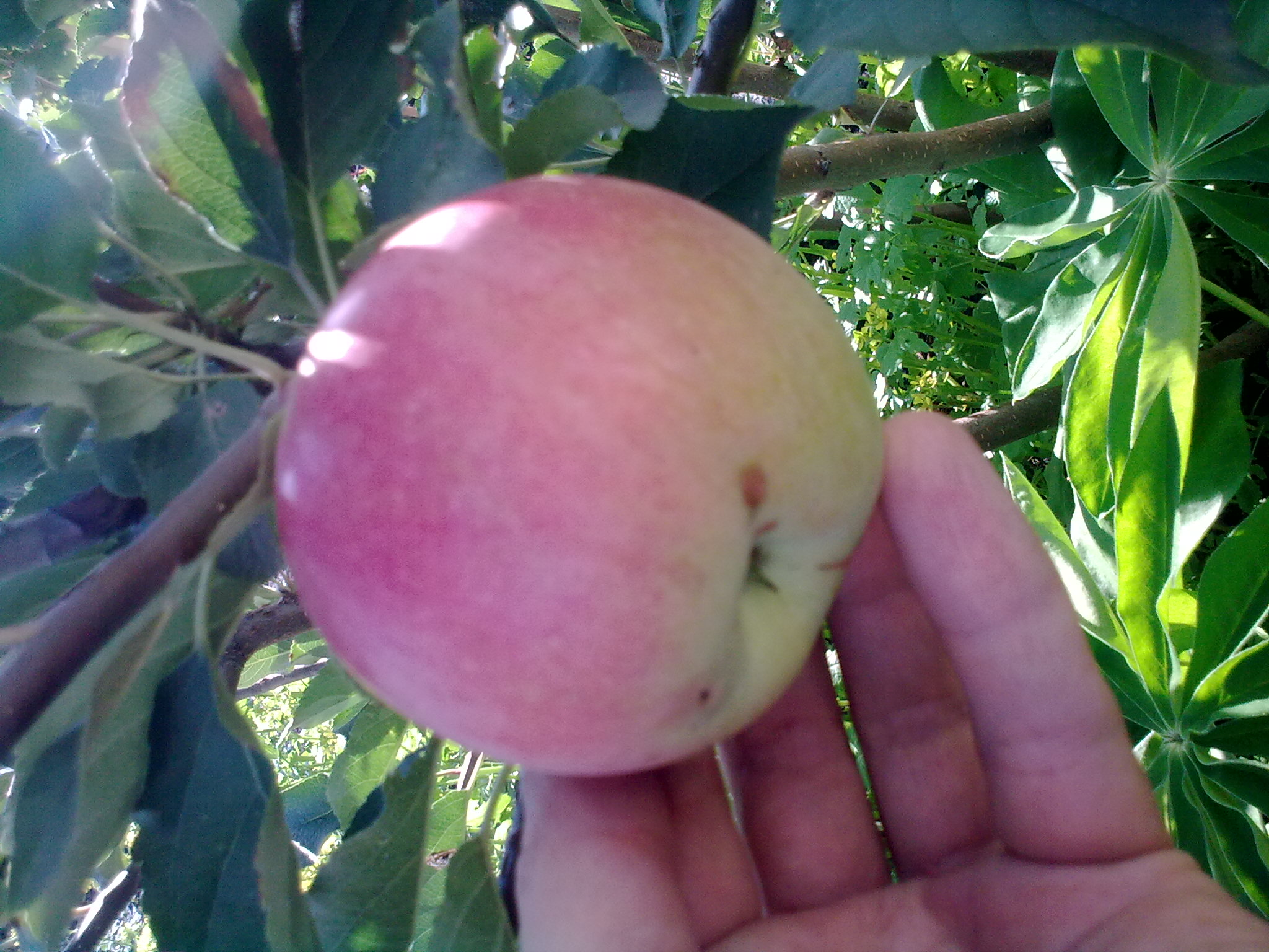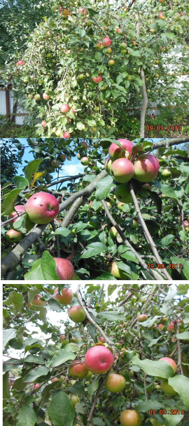Яблоки достаточно вкусные, мякоть мелкозернистая, хрустящая, но не грубая, сладко-кислое, т.е. сладость не приторная, есть умеренный аромат. Парши нет на дереве, и что удивительно - почти нет червивых, но осы уже к ним примериваются. Падать начали с дней 10 назад, падают только полностью окрашенные, т.е. поспевшие, еще очень мало упало, может пару корзин. Яблок очень много, так плодит первый раз. Сажали осенью 2006, проводник в первую же зиму замерз, сформировали чашей из побегов, пошедших выше прививки. Чаша и получилась ветви тонкие, согнулись до земли. Больше подмерзаний не было ( а мы поняли, что на нашей почве-глине сажать осенью опасно, теперь все в прикоп).