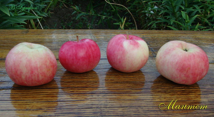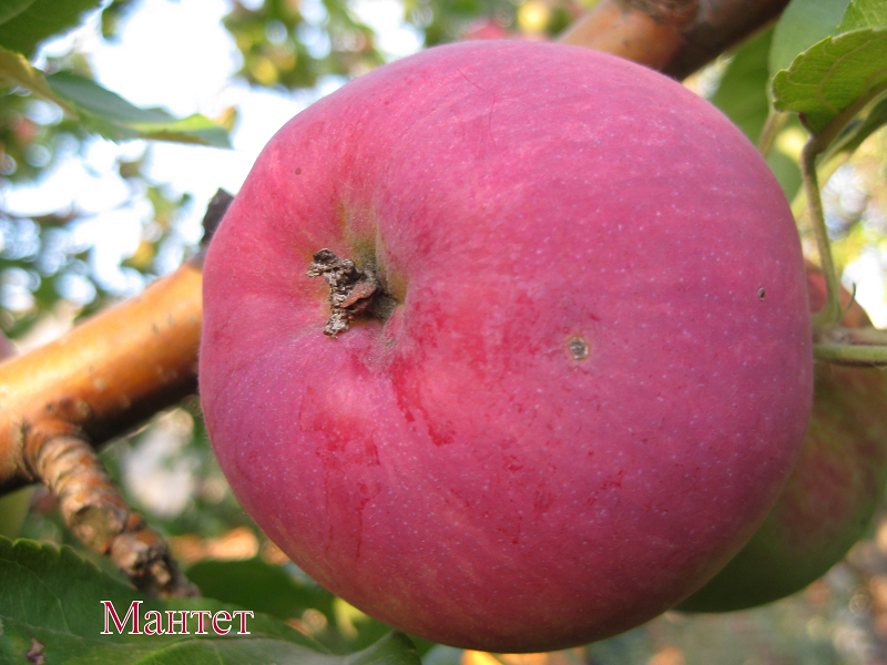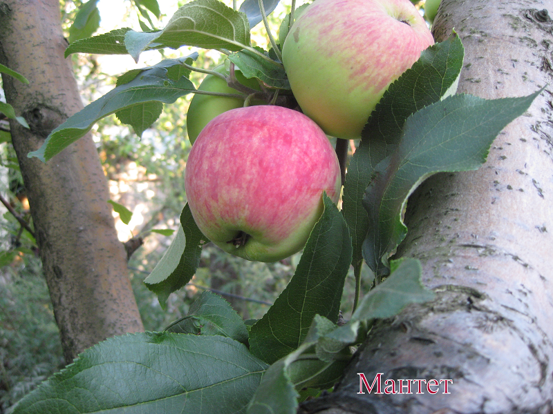Анина, анализируя Ваши фото сорта Мантет, пришел к выводу, что на фото другой сорт. Для сравнения выложил несколько своих фото сорта Мантет. На моих фото четко просматриваются основные сортовые признаки. Цвет коры многолетних ветвей коричневато-желтый, 2 – 3хлетних ветвей зеленовато-желтый. В Вашем случае – цвет коры зеленый. Лист у сорта Мантет имеет редкую нервацию, многие листья килевидные, основание черешка листа имеет антоциановую окраску. Край листа пильчатый. На Ваших фото листья плоские, с плотной нервацией, край листа городчатый, основания черешков не окрашены. Яблоко в начале окрашивания полосатое, затем эти полосы сливаются в красивый ярко- красный румянец с проступающими крапинами и полосами. Подкожные точки мелкие, малозаметные. Воронка узкая, без оржавленности, при полной окраске плода воронка окрашена в цвет плода. На Вашем фото у плода просматривается оржавленность , выходящая за пределы воронки, довольно крупные белые подкожные точки. Блюдце мелкое, складчатое, чашелистики довольно крупные, полуоткрытые. У многих плодов сохраняется венчик цветка – это сортовой признак. Семенное гнездо крупное, семенные камеры полуоткрытые или открытые в осевую полость. На Вашем снимке семенное гнездо маленькое, семенные камеры закрытые.