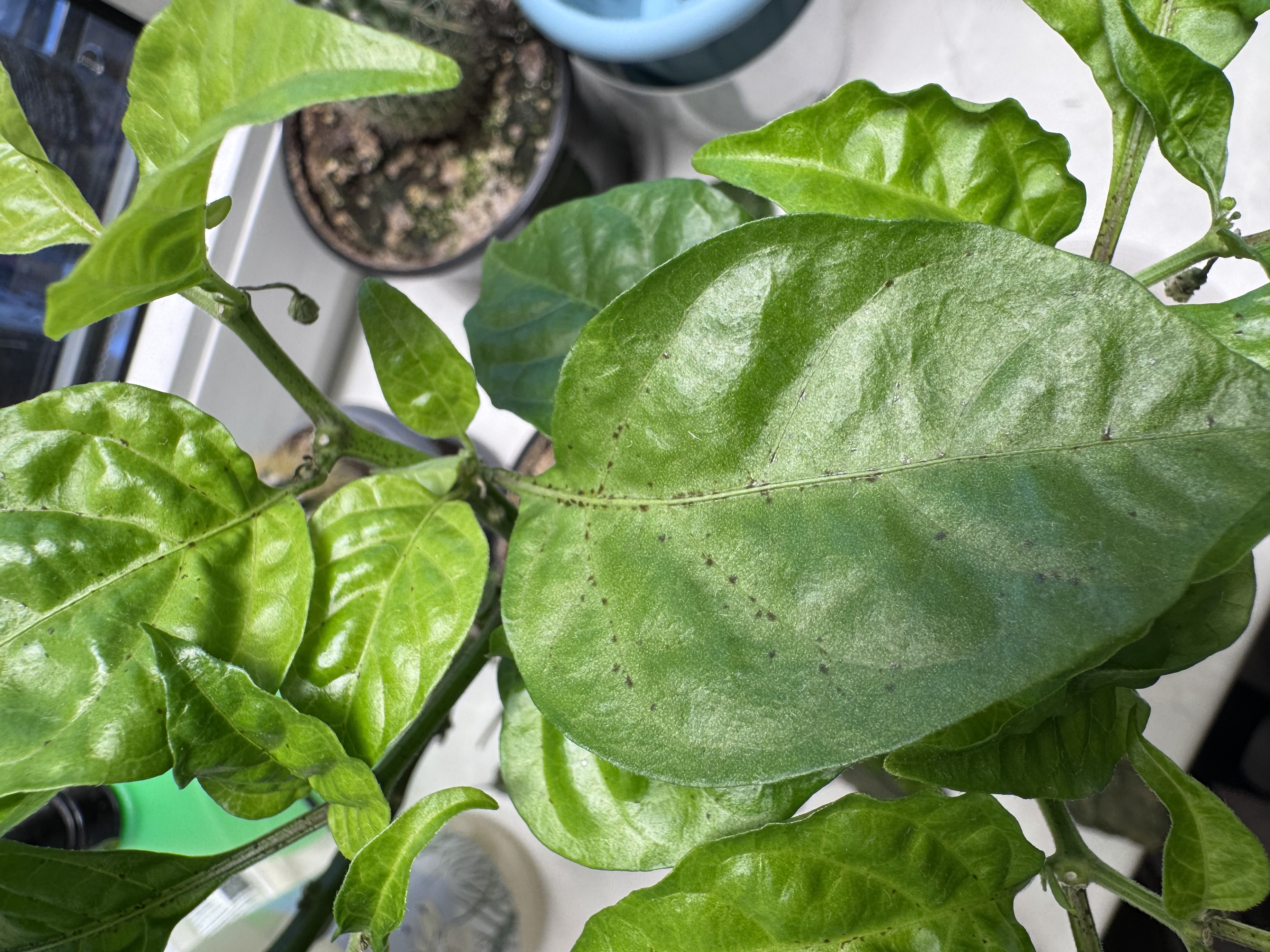 Первый цвёл всё лето как из пулемёта, но не дал ни одной завязи. По фото листьев ИИ яндекса определил "курчавость". Кроме неровности листьев, на них на всех ещё какие-то чёрные точки. И грунт в горшке "цветёт". Второй в какой-то момент пожелтел и сейчас выглядит, как на фото. Попыток цвести он не предпринимал. По условиям выращивания всё просто: над перцами - фитолампа. Универсальное удобрение (Эликсир №1 для томатов) использовал по инструкции раз в месяц.