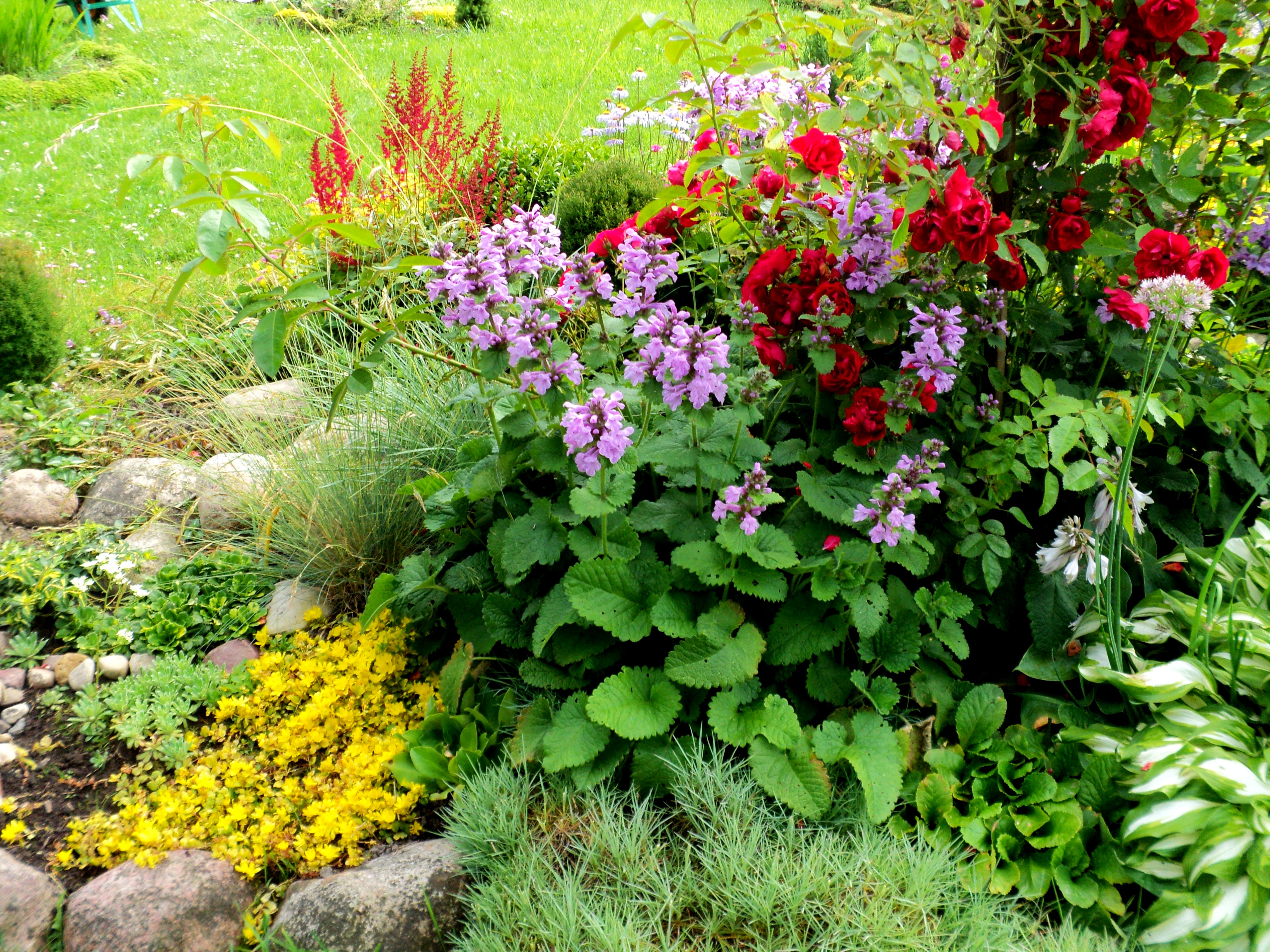 Во первых уже буду очень осторожна с красным цветом. Добавлю весной мускусных с простыми цветами. Некоторые сорта уходят по знакомым. Есть много ирисов сибирских, пионов, флоксов, спиреи, котовник теперь рассаживаю полянками. Эрики тоже будут. Камни нравятся очень. Думаю каким образом привезти штуки три крупных валуна серого цвета.