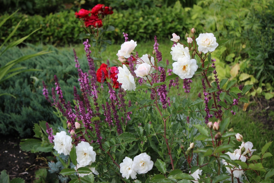А вот, как примиряет сиреневый шалфей алый и белый цвет роз.