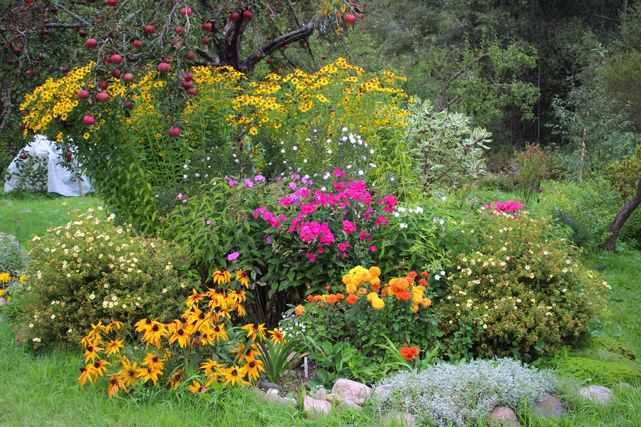Вот интересно. Лежащая рудбекия, рядом с бархатцами глаз не режет, а кориопсис наверху-режет. Если смотреть половину фотографии, нижнюю, то все замечательно. Открываешь всю- и расплывается клумба, становится блеклой. Значит ли это, что желтое должно быть внизу?