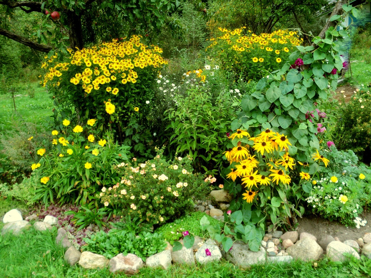 На моей жёлтой клумбочке, согласна, без высокого гелениума будет лучше. Я сразу не поняла, что речь о нём. Спасибо. Я и сама не очень довольна этой дылдой... Буду думать, что можно посадить вместо него, что-то пониже. И не жёлтое. Сажала высокое, чтобы закрыть сад. Там справа виден дёрен Элегантиссима... может, его увеличу. Честно, это место у меня формировалось стихийно без всяких планов.