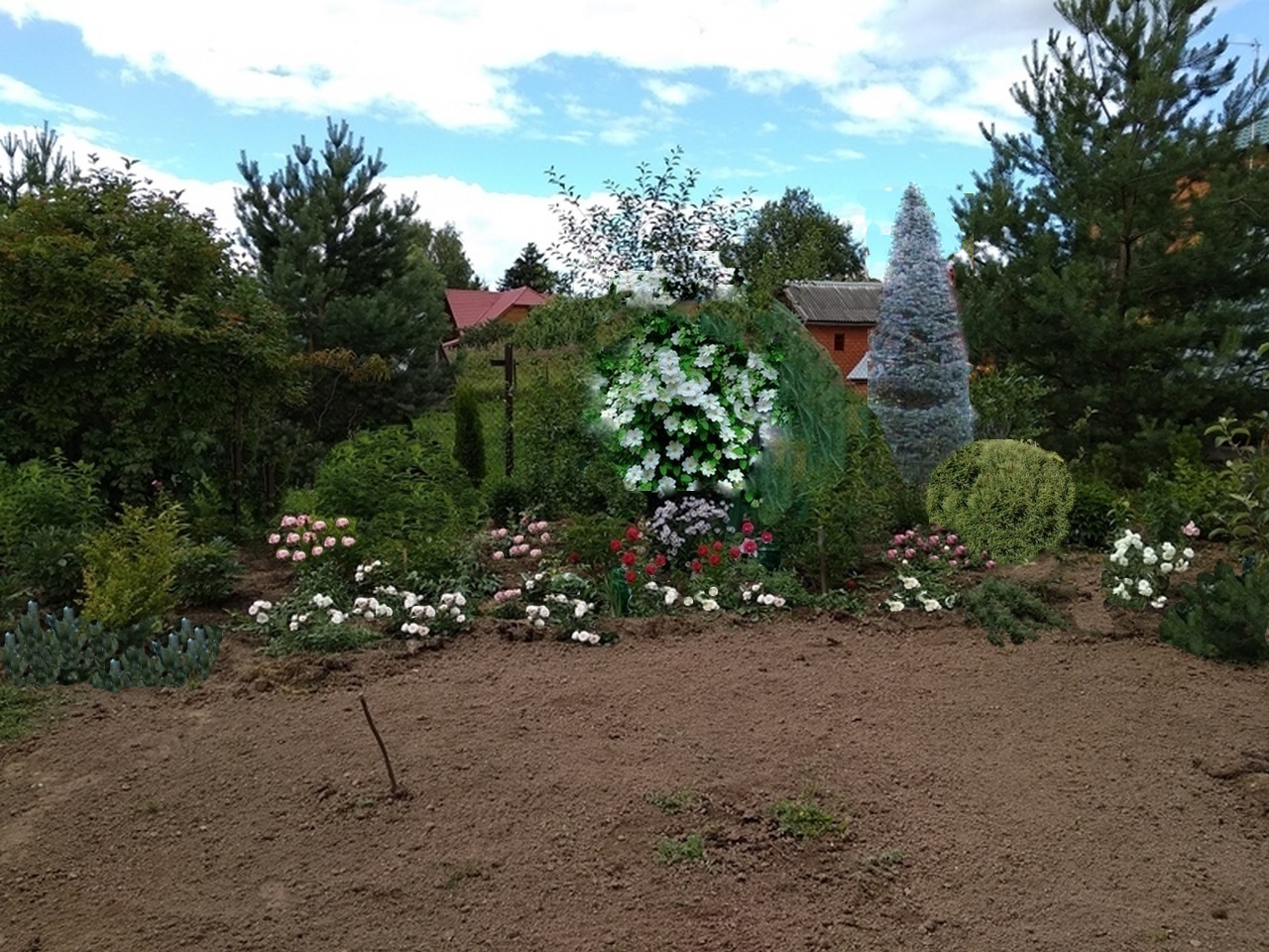 Понимаю, роз уже хватает. Они в основном низкие? Вот и отлично! Нижний ярус низкие белые, сзади пара кустиков розовых повыше. И хватит!!! Эти же разрастутся ещё... Хорошо, что у соседа тоже хвойные растут. Можно к забору подсадить что-то среднее по высоте. А горточка это будет или хвойное, или декоративный кустик - это не столь важно. Просится шарик средней высоты. Там что-то уже растёт же? А солнышко откуда светит? Где юг?