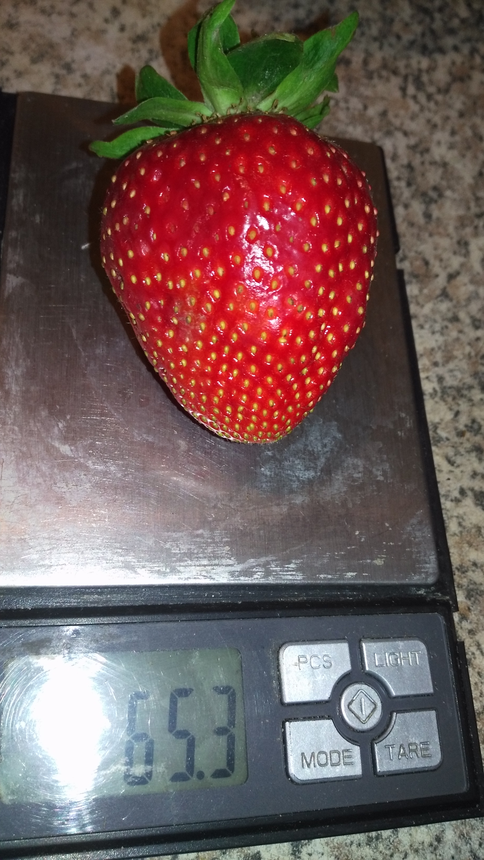 Очень крупная ягода, в первых сборах за 60 г. Ягода сладкая, в меру плотная, с хорошей транспортабельностью. Абсолютно не потеряла плотности и вкуса на фоне осадков. Урожайность хорошая, на двухлетках вообще отличная. Из холодильника такая же сладкая, да и просто приятно ягоду такого размера в руку взять.