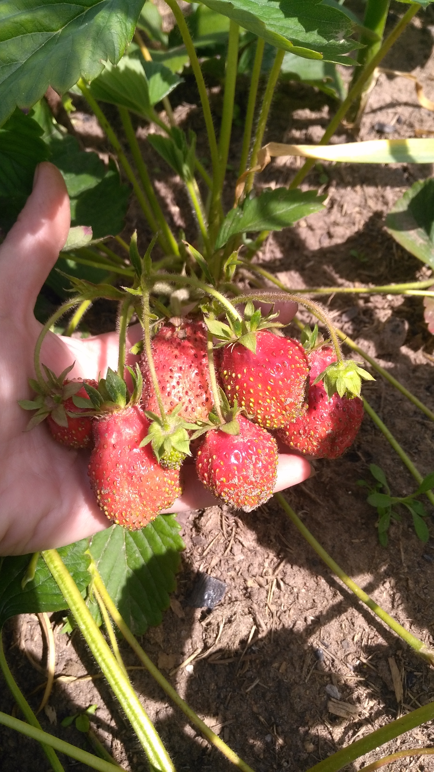 Мы из Удмуртии, да нынче погода совсем не радует, ночи до сих пор холодные, возможно из-за этого, несмотря на все обработки, на нескольких ягодах уже проявилась фитофтора((. Но, ягоды, на удивление начинают поспевать в обычные свои сроки. Как всегда одним из самых первых поспел Мармион. Это наверное самый любимый сорт, потому что нравится всем членам семьи, особенно детям. Сорт уже лет 9 в коллекции и очень надеюсь его сохранить. В моих условиях, Мармион почти идеальный сорт по зимостойкости, силе роста, урожайности, вкусу, устойчивости, а ещё из него самое вкусное варенье получается, т.к. ягода полностью поспевшая очень темная, почти черная. Даже в технической спелости, ягода сладкая . Единственным недостатком наверное можно назвать мельчание ягоды и среднюю транспортабельность и устойчивость к осадкам, но за вкус на это не обращаешь внимания. Про итальянцев, это точно)). Не каждый сорт пойдет в наших условиях. Большие надежды возлагала на сорт Гарда, но пока только разочарование. Первые ягоды вкус не набрали, хоть и очень красивые, но они в добавок ещё и слишком плотные и с выраженным хрустом, чего я просто не люблю. Будем наблюдать, на подходе ещё несколько итальянцев...