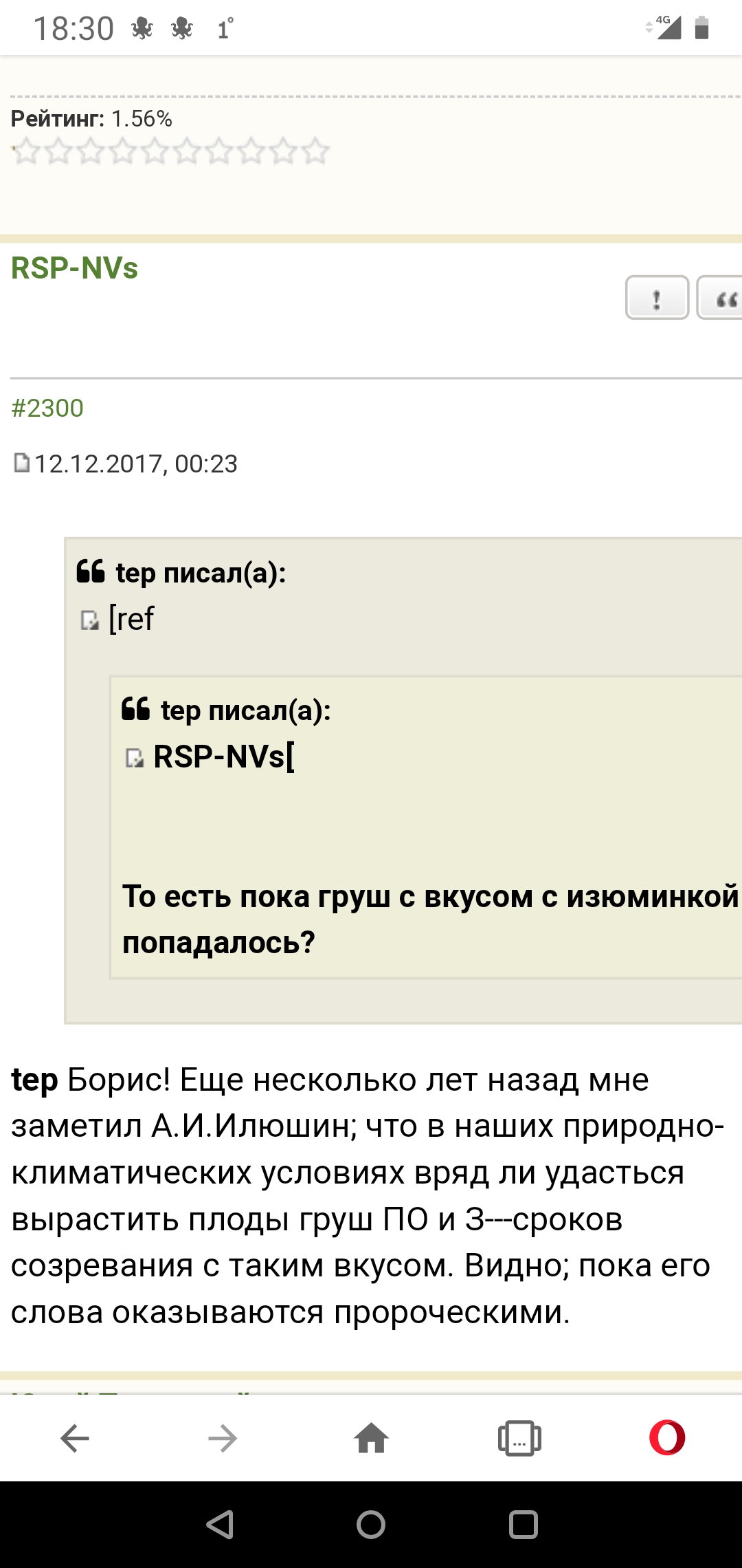 tep, Борис, Вы сами подтвердили мои предположения. Если Илюшин на основе своего многолетнего опыта не рассчитывал получить груши с южным вкусом, то в моих условиях это ещё более сомнительная возможность. Хотя, да, климат меняется(я бы сказал - погода сломалась), и появляются новые сорта, есть поле для экспериментов. Но удвоения САТ в своем районе при своей жизни я вряд-ли увижу. Поэтому так тщательно и копаюсь в сортах, и сортоподвойных комбинациях. Позапрошлая зима(23-го марта температура -32°) укоротила ВСЕ груши, десятка полтора сортов, по уровень снега.