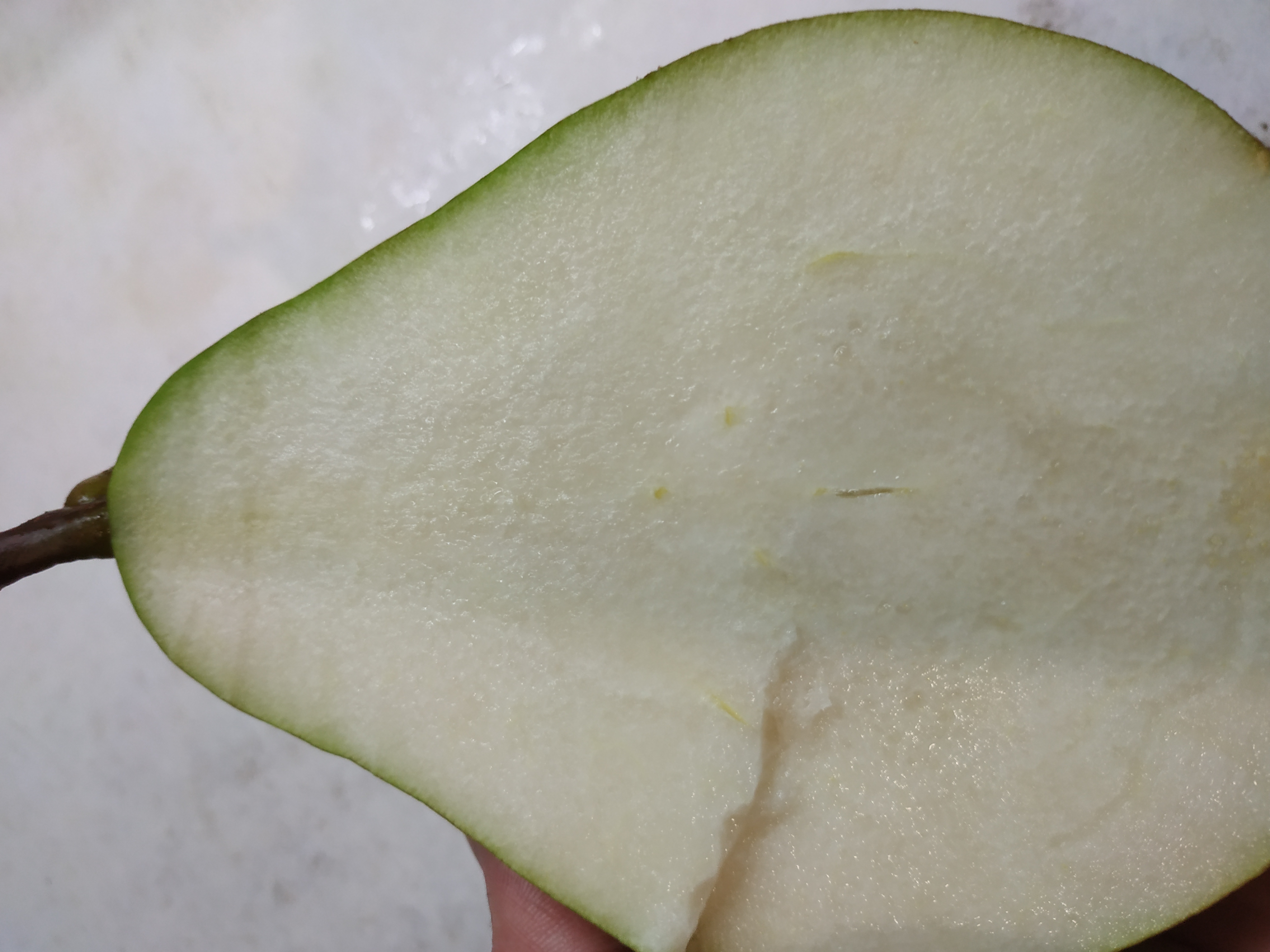 Второй плод долго висел на дереве.Храниться не захотел.Пожелтел,видно на фото.Разрезал,а семенная камера потемнела.Чудом груша не пропала.