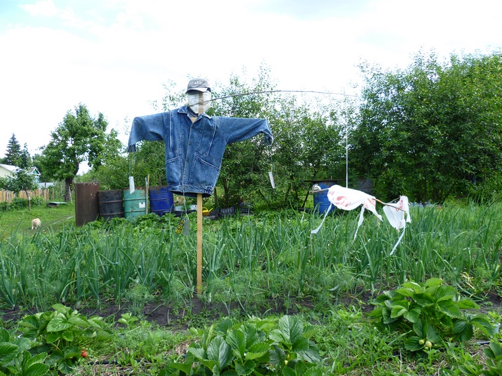 Меня доставали грачи,поручил сыну сделать пугало,вот что получилось,он ещё сделал макет птицы(где то в инете нашёл ролик про него) пять дней грачи летают,но не садятся в приличном радиусе,наверное пока присматриваются.Макет птицы шуршит на ветру,планирует над грядками как будто хищная птица.