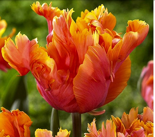 Тюльпан попугайный Амейзинг Пэррот - цветок розовато-абрикосовый с нежно-оранжевым краем. Тюльпаны этого класса имеют самый необычный и экзотический вид: лепестки их имеют глубоко изрезанные края, иногда волнистые, чем напоминают растрепанные птичьи перья. Широко раскрытый цветок может достигать в диаметре 20 см.