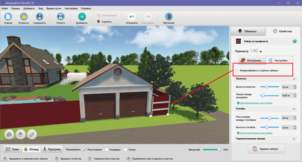 Далее я обношу участок забором, ставлю гараж гараж и калитку. Заборов в каталоге несколько — кирпич, дерево и т.д. Высоту и материал столбов и полотна можно менять. У меня часто внутренняя сторона забора «выворачивается» на улицу, но ее легко вернуть во двор через «Свойства» и кнопку «Инвертировать»: