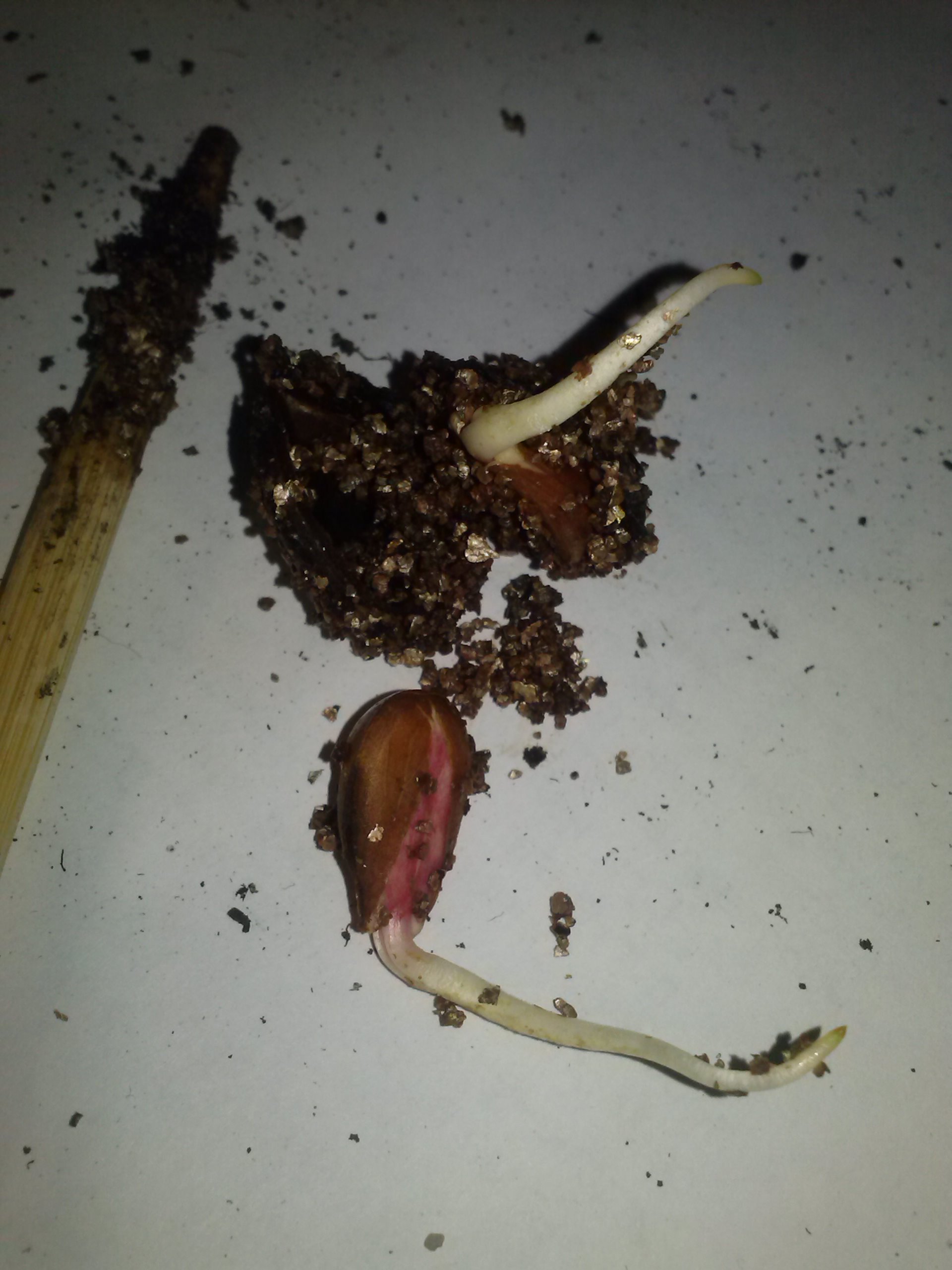 это фото - из 1 косточки 2 зародыша проклюнулись!! они так активно косточку порвали и уже без неё! когда как другие в створке косточки корешок пока пустили!!