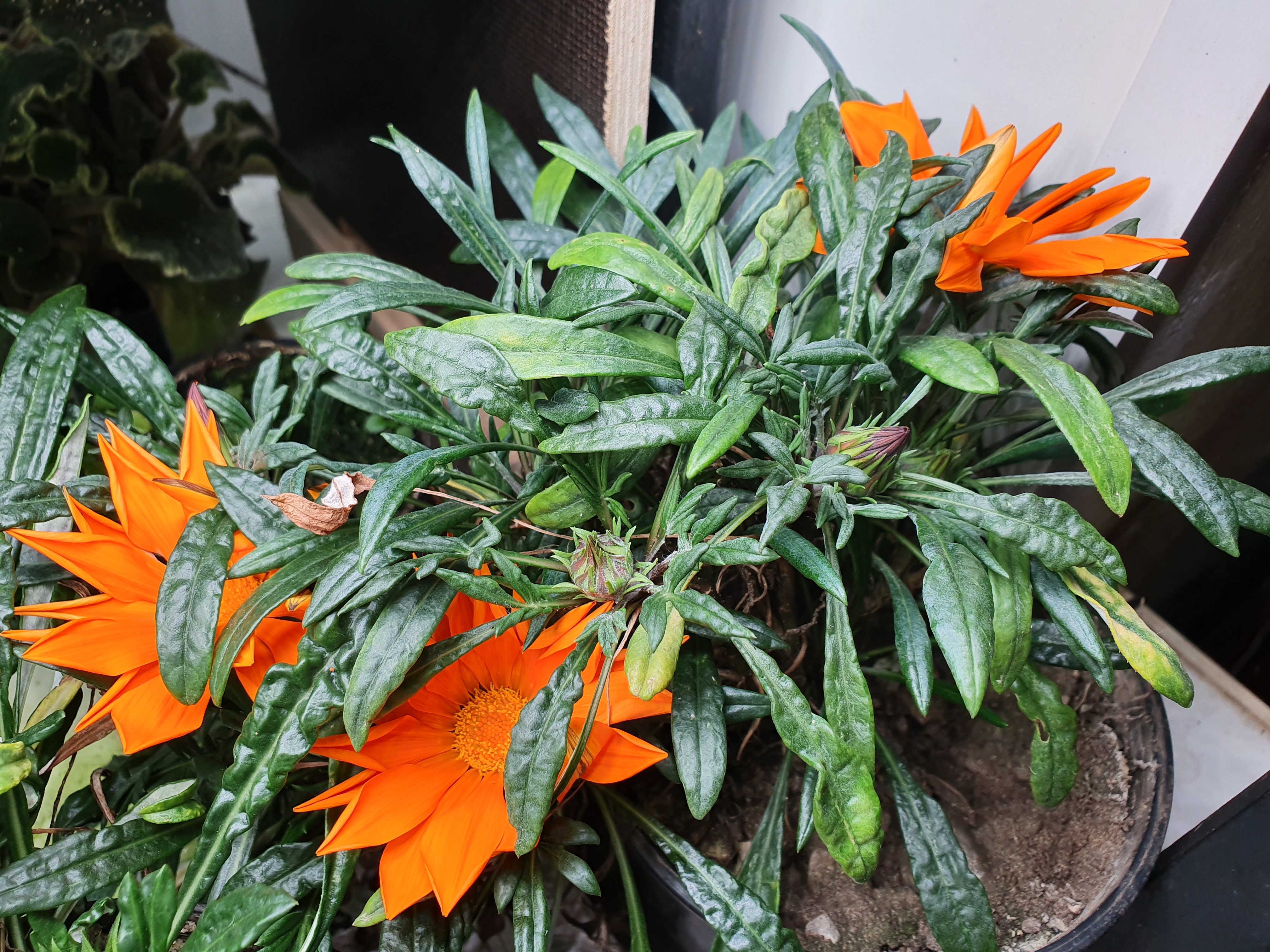 Газания постоянно дает цветы и подращивает новые бутоны. Но! Под прекрасным мощным светом она раскрываться полностью не хочет. Мало ей. В солнечный день ситуация чуть лучше, но таких дней мало. Маточный куст.