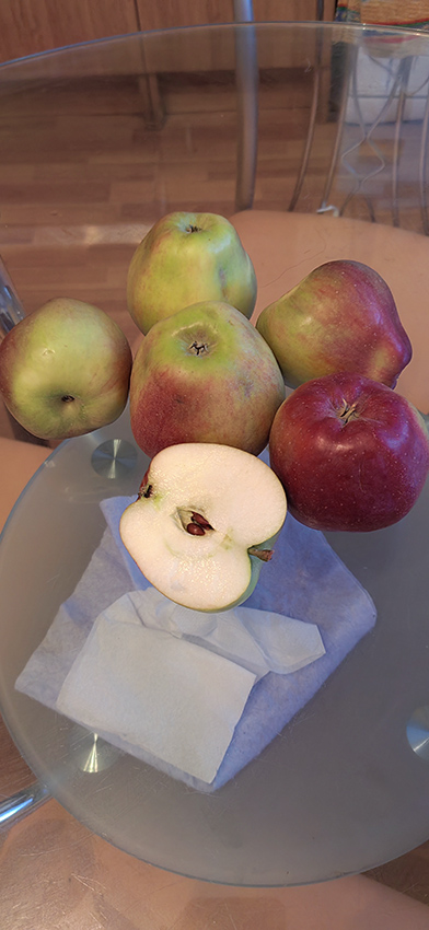 Сегодня , в дикси сезонные яблоки из Белоруссии 49р.Среди них определил Имант,взял.Вот теперь на 100% уверен , что у меня в саду не Имант.Путало то ,что в инете картинки Иманта почти все красные,как у моего сорта.Дегустировал, сахар 13бр., вкус еще явно не дошел, значительная кислинка,но даже в таких параметрах съел с удовольствием.Конечно не Топаз...Из не многих сигналок понравился Топаз, понравилась Пинова, но чувствуется в ней что то из характеристики ,данной этому сорту знатоком яблок Брайан Франгом ,,Папье-маше из фруктовой шелухи".Имант положил дозревать.