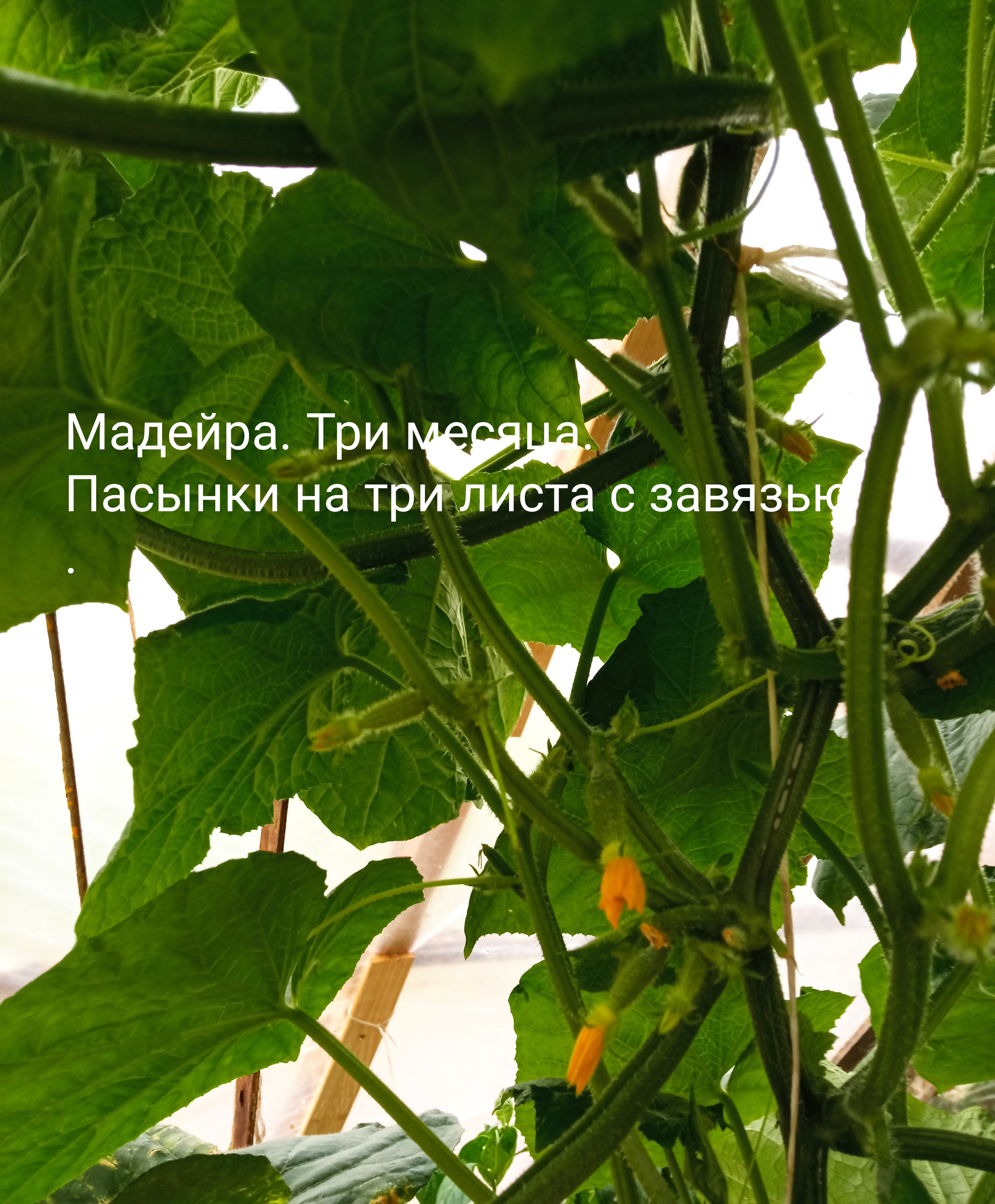 Спустя три месяца трехметровая плеть пустая. Только на макушке есть завязи и небольшой сбор. И на следующей партии помоложе такая же картина. Решил не удалять пасынки, что стали появляться. Из каждой листовой пазухи стали появляться по нескольку ростков. Оставляю два самых сильных, как только можно рассмотреть. Остальные удаляю. Потом прищипывал их на два листа. Завязи появились. Жду.