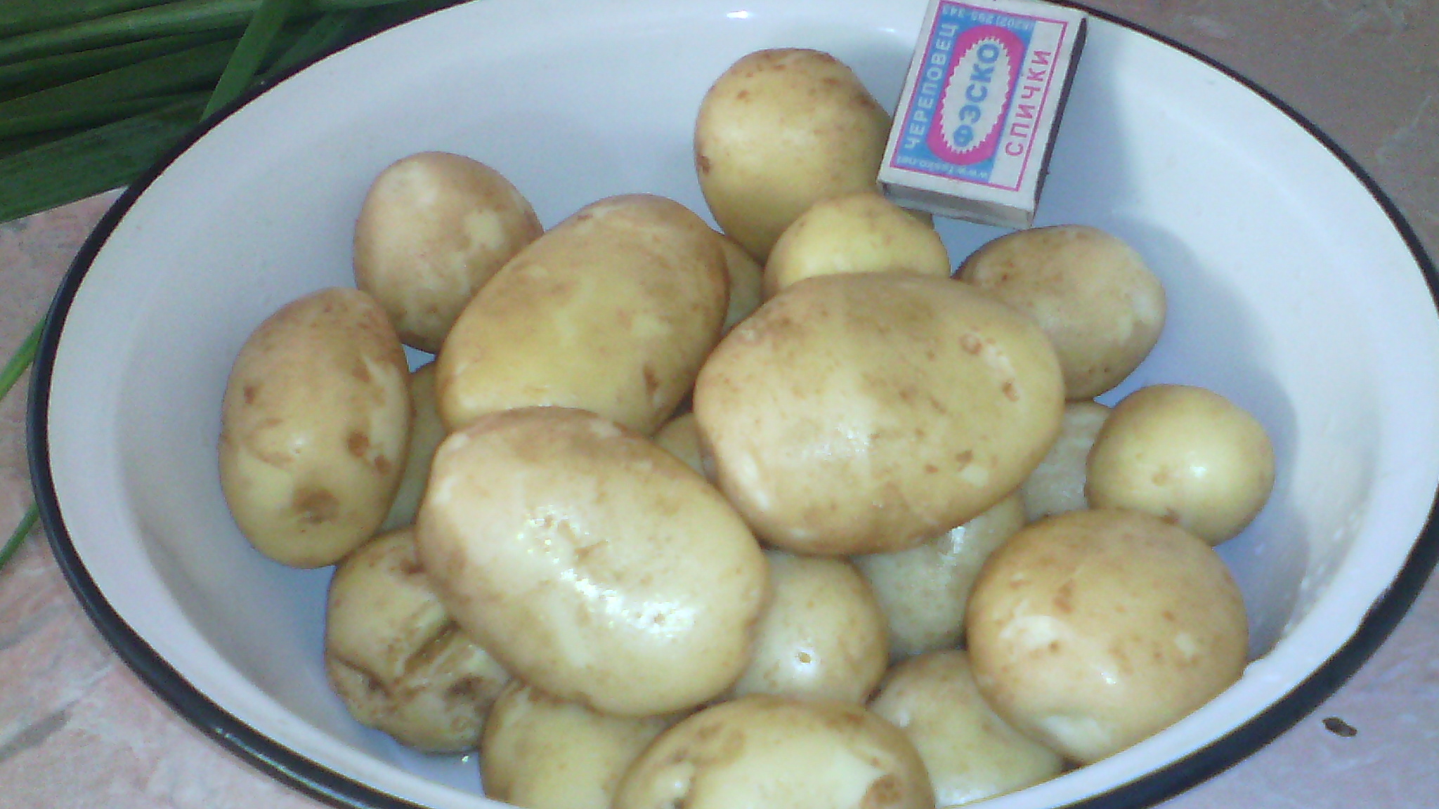 Выкопала полностью 3 куста из ранней, которую высаживала в грунт 24 апреля рассадой. В первом кусту (адретта) почти ничего не было, да и та репаная, корявая, а вот второй и третий кусты (сантэ, по-моему) были отличные. На раннюю никогда не беру из семенного фонда. Просто выбираю из ведра столовой подходящие по размеру, после появления ростков распределяю по "мастям". Адретту на рассаду использовала впервые, не знаю, почему некрасивые плоды получились. Влажность зашкалила, или низкие температуры почвы её измучили