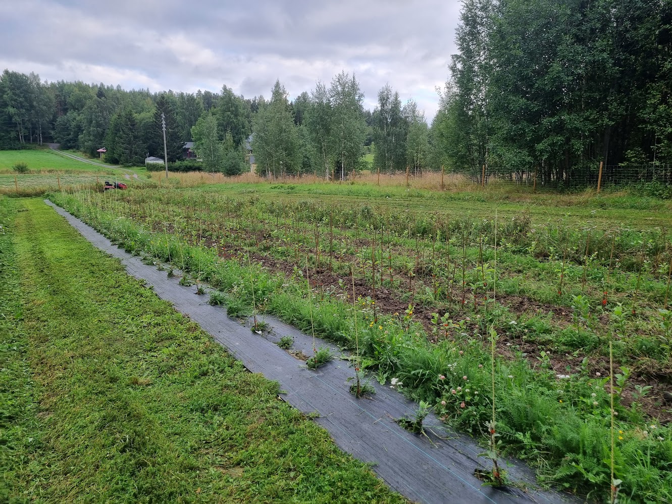 Очевидно у нас береза халявна(не имею понятия так ли это в суоми), но имеет большой недостаток, крайне быстро сгнивает(либо в земле, либо сверху обрастая грибами или помогают насекомые) и колышка хватает на год, а если очень повезет на два, но не более, бамбуковые палки служат в моих условиях 5-7 лет, грибами и вредителями не поражаются.