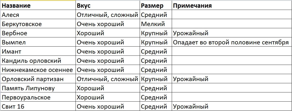 В обзор не включил сорт Беркутовское (его яблоки выросли пока не крупными и, по этой причине, фотографий сорта я не делал), но вкус мне понравился и в итоговую таблицу я его включил. Также в итоговую (обзорную) таблицу включил описанное ранее яблоко с осенне-зимним сроком потребления: