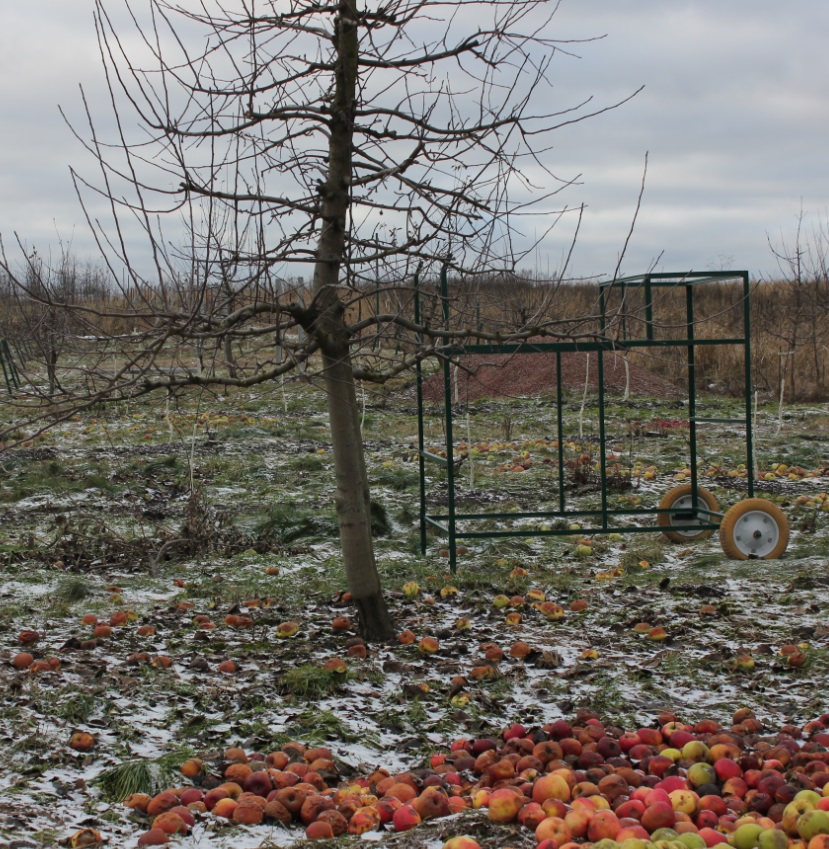 Срок съёма определяю традиционно - по йодкрахмальной пробе. Есть другой лимитирующий фактор - прогноз погоды. В этом году позднезимние (Топаз, Хоней крисп, Синап Орловский) - снял после 20 октября, точно сейчас не скажу, полевой дневник (еще с института приучили вести) сейчас на даче.Погреб на открытом месте (холодный и сырой из-за конденсата, влажность 99%,температура +2 - 0). Грунт погреба средний суглинок с примесью природного известняка. Расстояние от дна погреба до грунтовых вод - около 4-5 метров. Стены и потолок - железобетон. Для хранения стал делать из стальной арматуры каркасы размерами 50 см (высота) 80 см - длина, около 60 - ширина). Каркас покрываю грунтовкой "по ржавчине" которая. Внутрь ставлю стенки из старого поликарбоната. Передняя стенка поликарбоната не на полную высоту, чтобы рука могла внутрь проникнуть. Перед закладкой контактную поверхность поликарбоната протираю спиртом. Каркас устанавливаю - наполняю яблоками - сверху другой, и так можно один-на другой четыре каркаса. В таком виде хранятся гораздо лучше, чем в овощных ящиках.