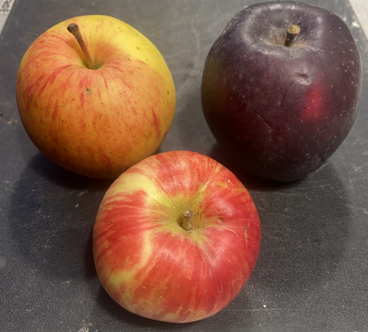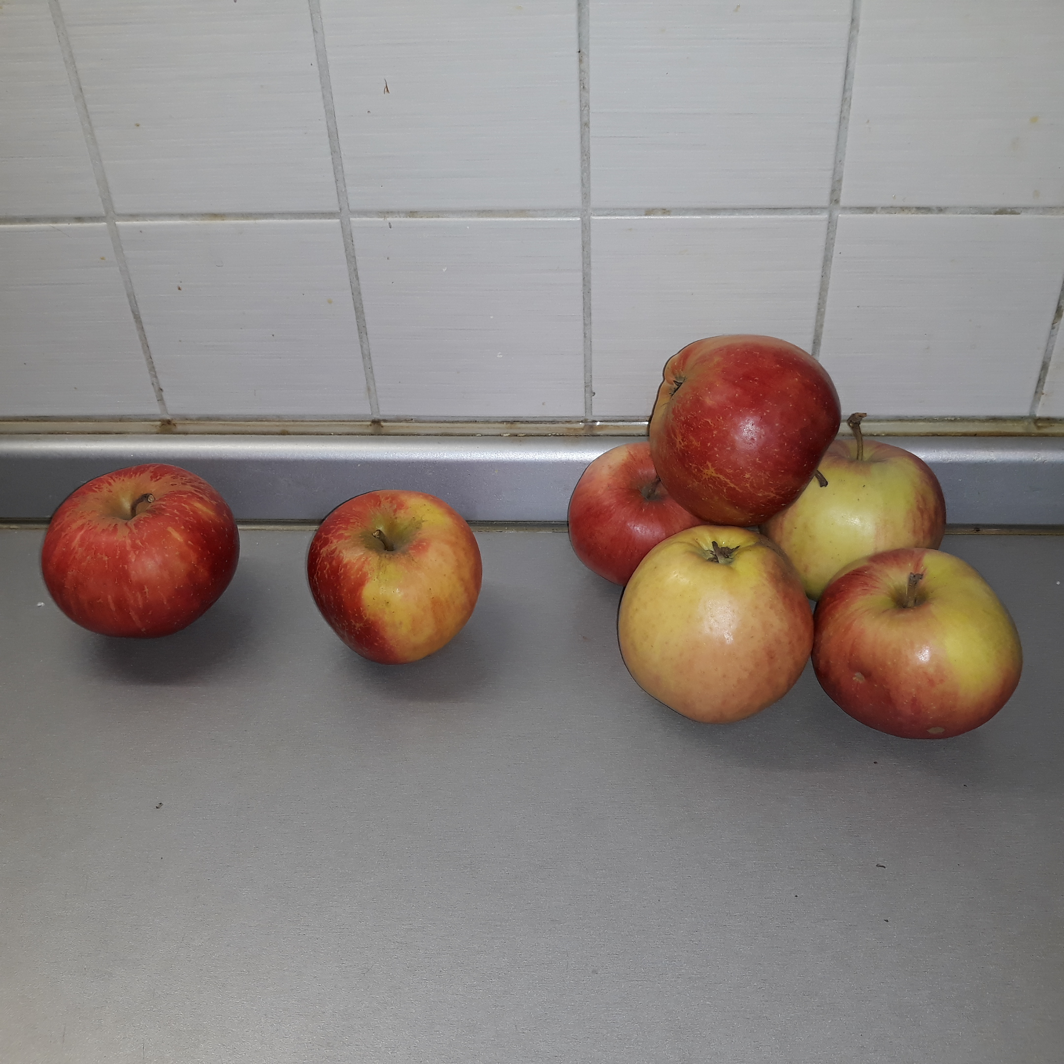 Слева-Ханикрисп,Пинова и Лигол.ХК готов к потреблению,сочный,его специфический вкус представлен более чем,сок брызжет,мякоть колкая.Пинова-не готова ,малосочный жмых портит картину.Лигол также пока не дошёл до пика кондиций-крахмал ощущается.Все плоды лежат под открытым небом,укрытые пленкой от осадков и птиц.