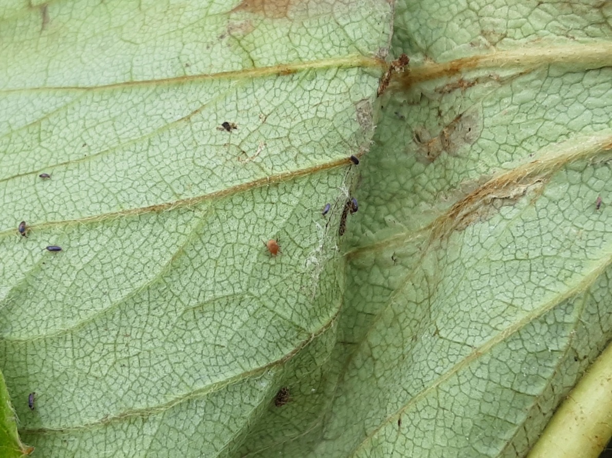 Совка. Белокрылка и паучок. То ли самка тли("хвостик" характерный), то ли нимфа листоблошки? Клещ с тремя парами ног!? 3 пары ног бывает у личинок. Но личинки то клещей не зимуют. Вроде, по той же причине - не иксодовый. Ну, не знаю... Вот и думай, от чего опрыскивать...