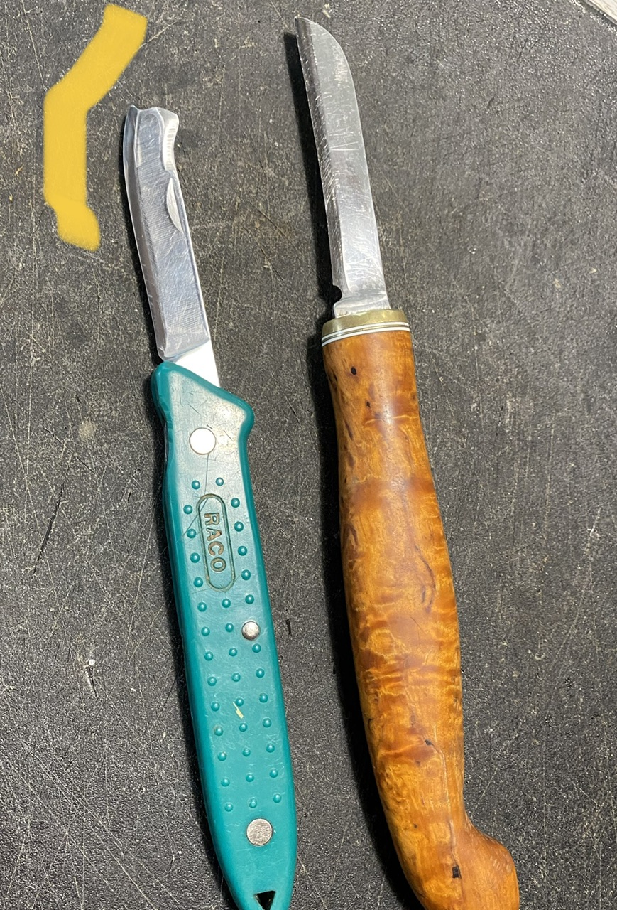 Использую сейчас 2 ножа. Справа - для окулировки вприклад, очень точный рез, заточка под углом 15’,слева- за кору, сделал закругленный носик и переточил под 20’.