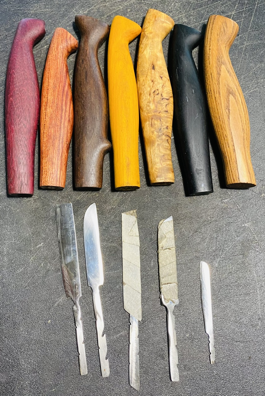 Понемногу делаю заготовки для зимнего рукоблудия, металл 2х видов (61 и 63 HRC), рукоятки из разного дерева: ясень, венге, граб, розовое дерево, карельская берёза и др. .