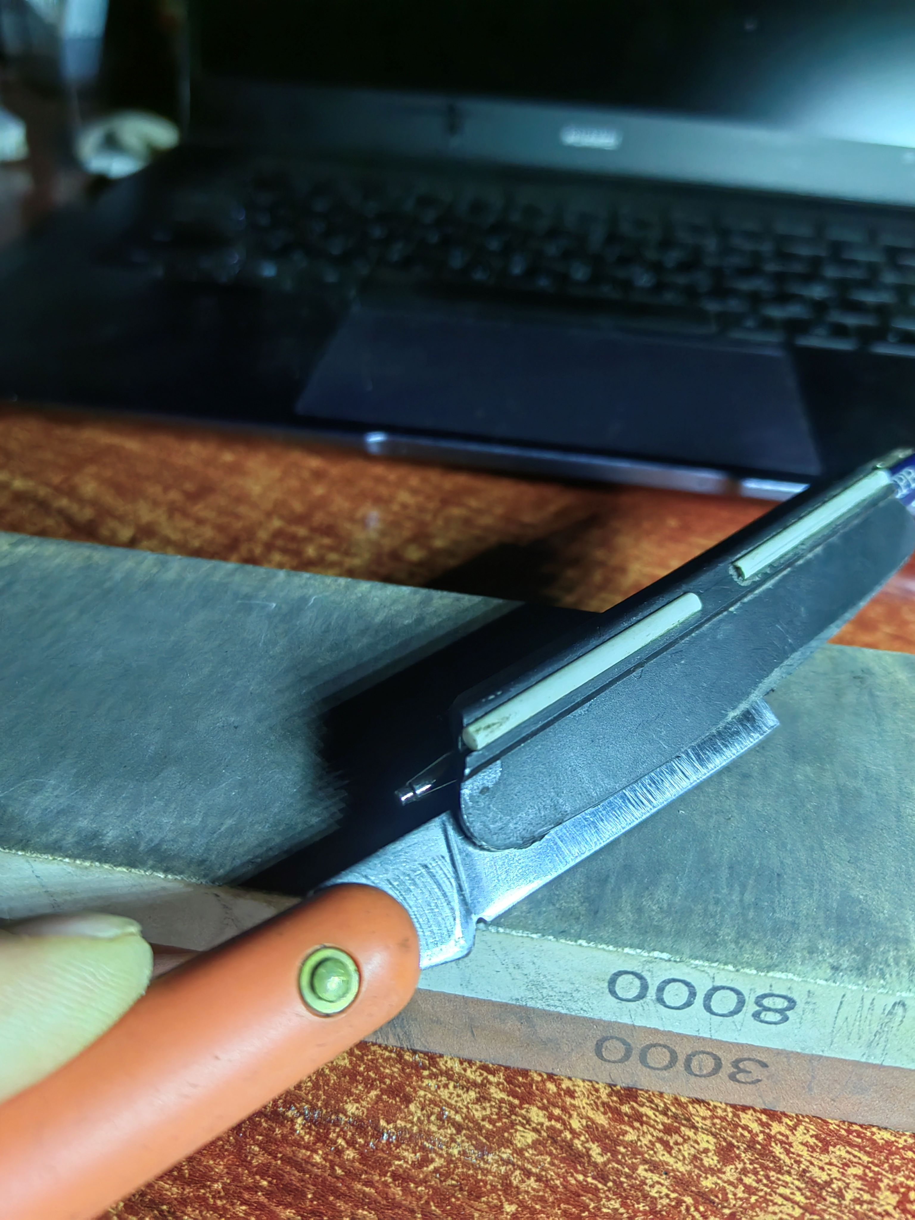 Доработал специальное приспособление до угла 30гр.,у ножей финланд и DUE BUOI 202AР заводская заточка была 40-45гр.Ножи точить не приходится, подвожу на камушке 8000 и ремне.На фото ваших ножей видны царапины заточки ,вы действительно их точите , при угле заточки менее 20гр. происходит выкрашивание кромки и приходится постоянно выправлять.Так вам ножа надолго не хватит, кромка уже пошла полумесяцем.