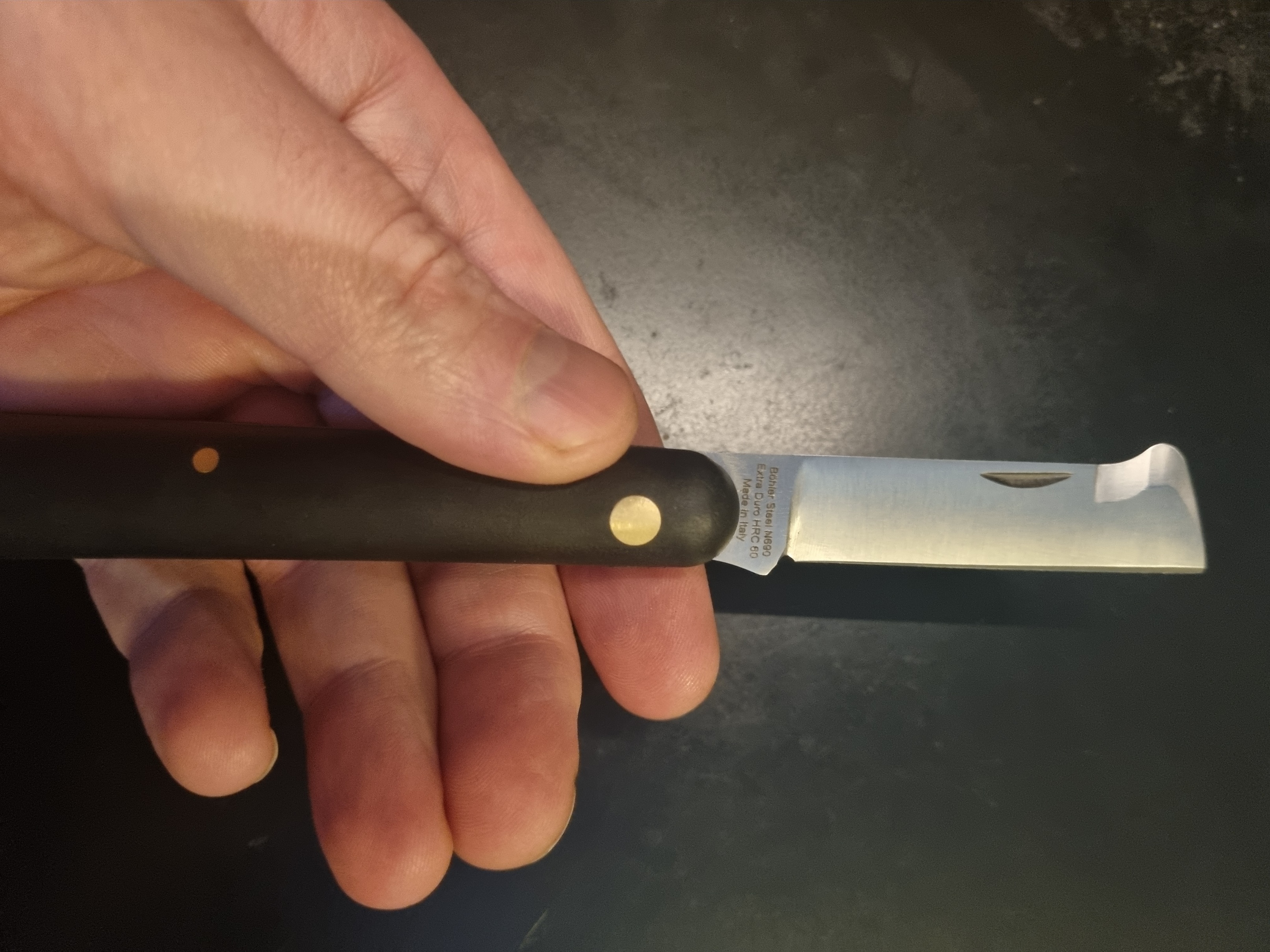 Старые ножи растерялась, прислали новый DUE BUOI Super Simple 202 Böhler N690. Сталь повышенной твёрдости HRC 60.
