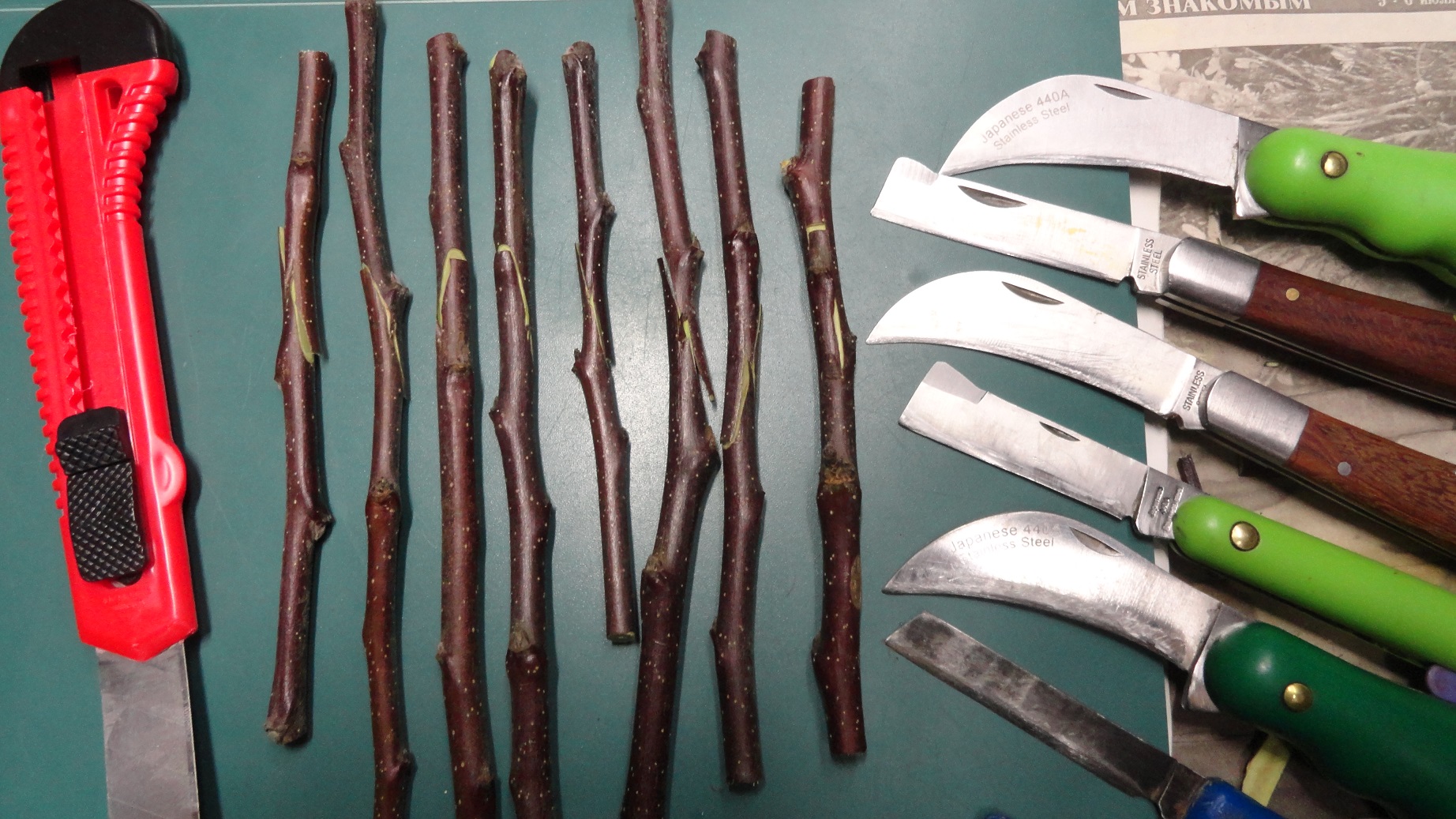 Сегодня совсем потеплело (+7), снег который выпал три дня назад весь растаял. Пошел в сад и вспомнил, что лет -5-6 назад где-то выкладывал фото своего прививочного "арсенала". Решил найти все ножи, которыми в разные годы делал прививки и провести мини тест. Не участвовал №2, долго ходил с ним за грибами, потерял пару лет назад, но я его почти не использовал в саду.