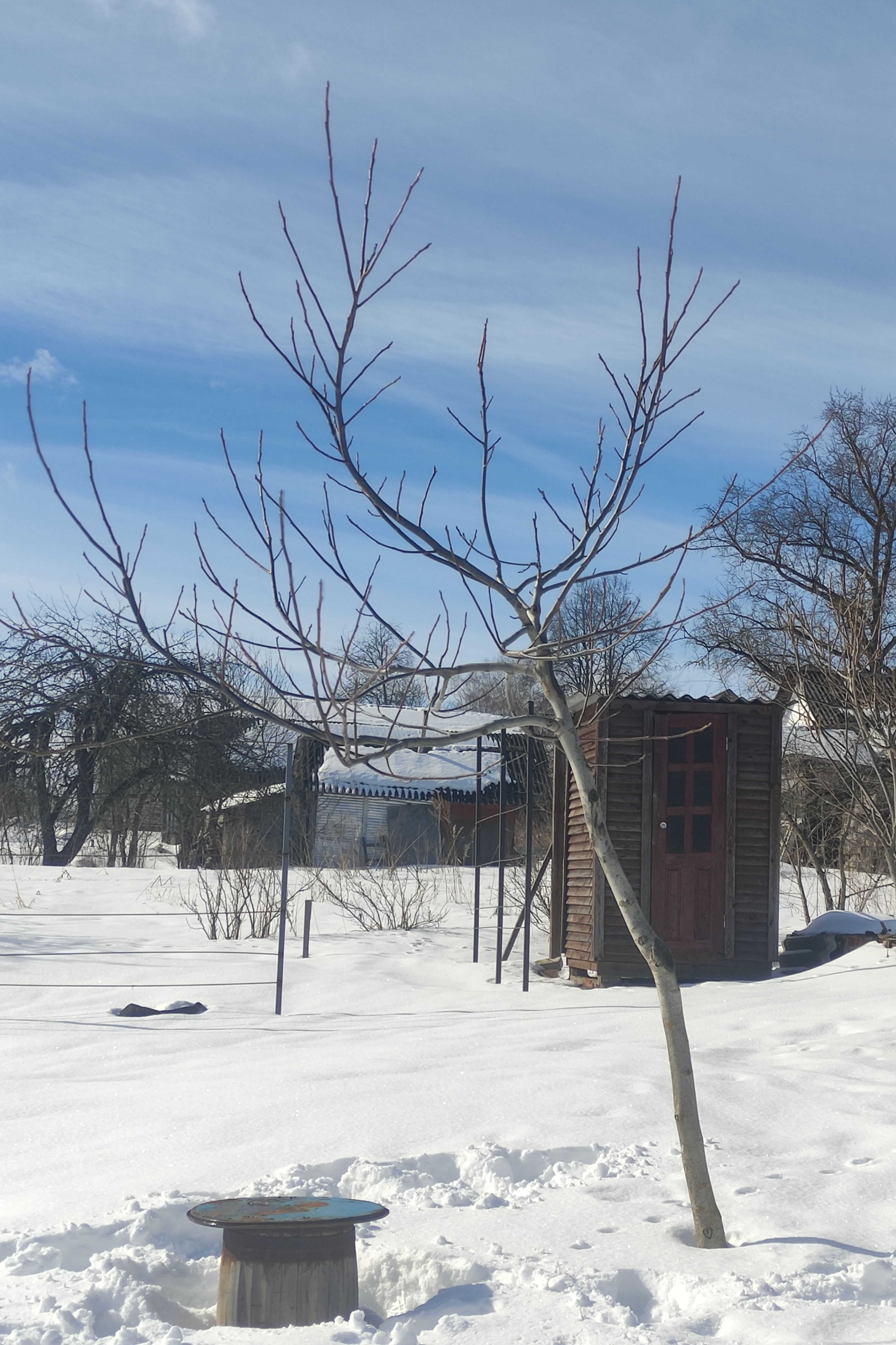 Смотрел как перезимовали орехи. Пока ещё не понятно. На месте срезанной веточки выступила капля сладкого сока. Хотя в саду снега почти по колено.