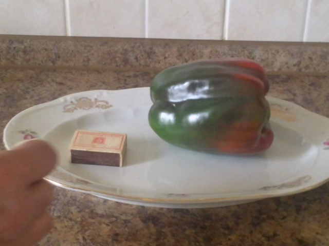 Средняя. На кусте одновременно 5 перчин, но в этом году у меня почти все такие, поливаю мало и подкормки весной дала неудачно, практически не дала. Но крупные и вкусные. Кстати, хочу поблагодарить за новый для меня сорт, Красный Бык, кажется от Тамары. Очень крупный и очень сладкий вкуснющий перчик. Спасибо.