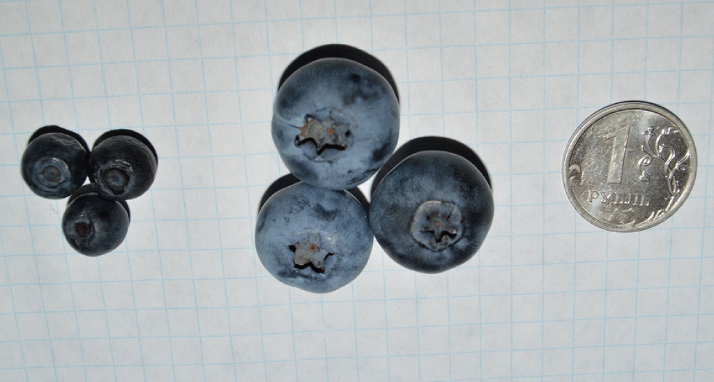Размер ягод садовой голубики и лесной черники. Голубика не самая крупная , крупную сьели
