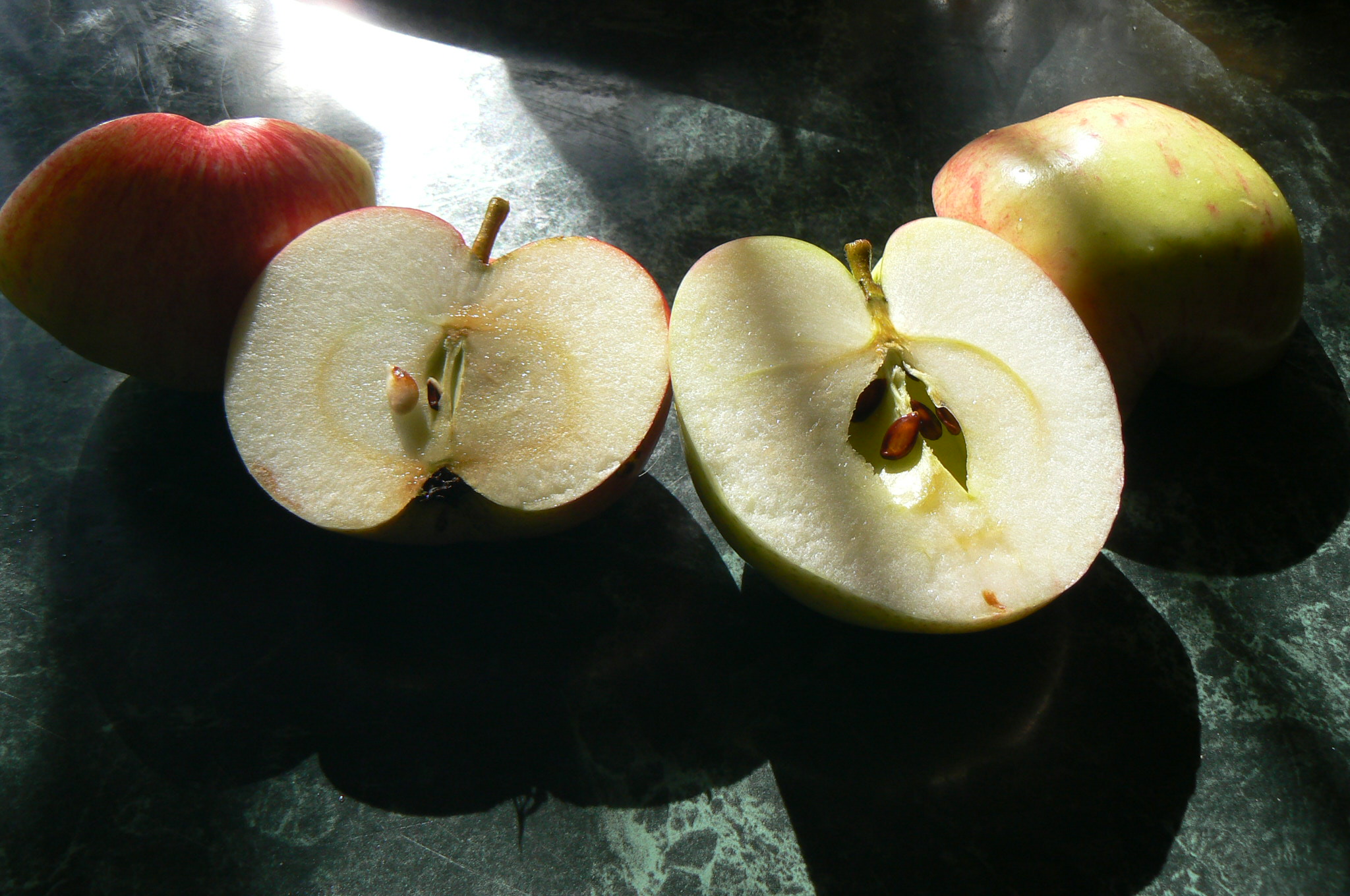 Есть несколько яблок. Плодоножки в основном длинные. Но есть и короткие. На фото среднее верхнее с короткой. Одно яблоко разрезала. Поспели в конце августа, начале сентября. Мягкое, сладкое, сочное.