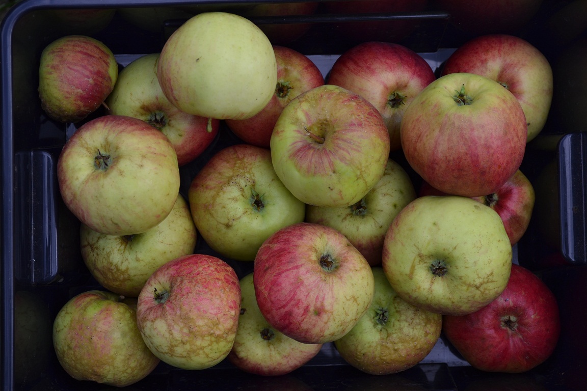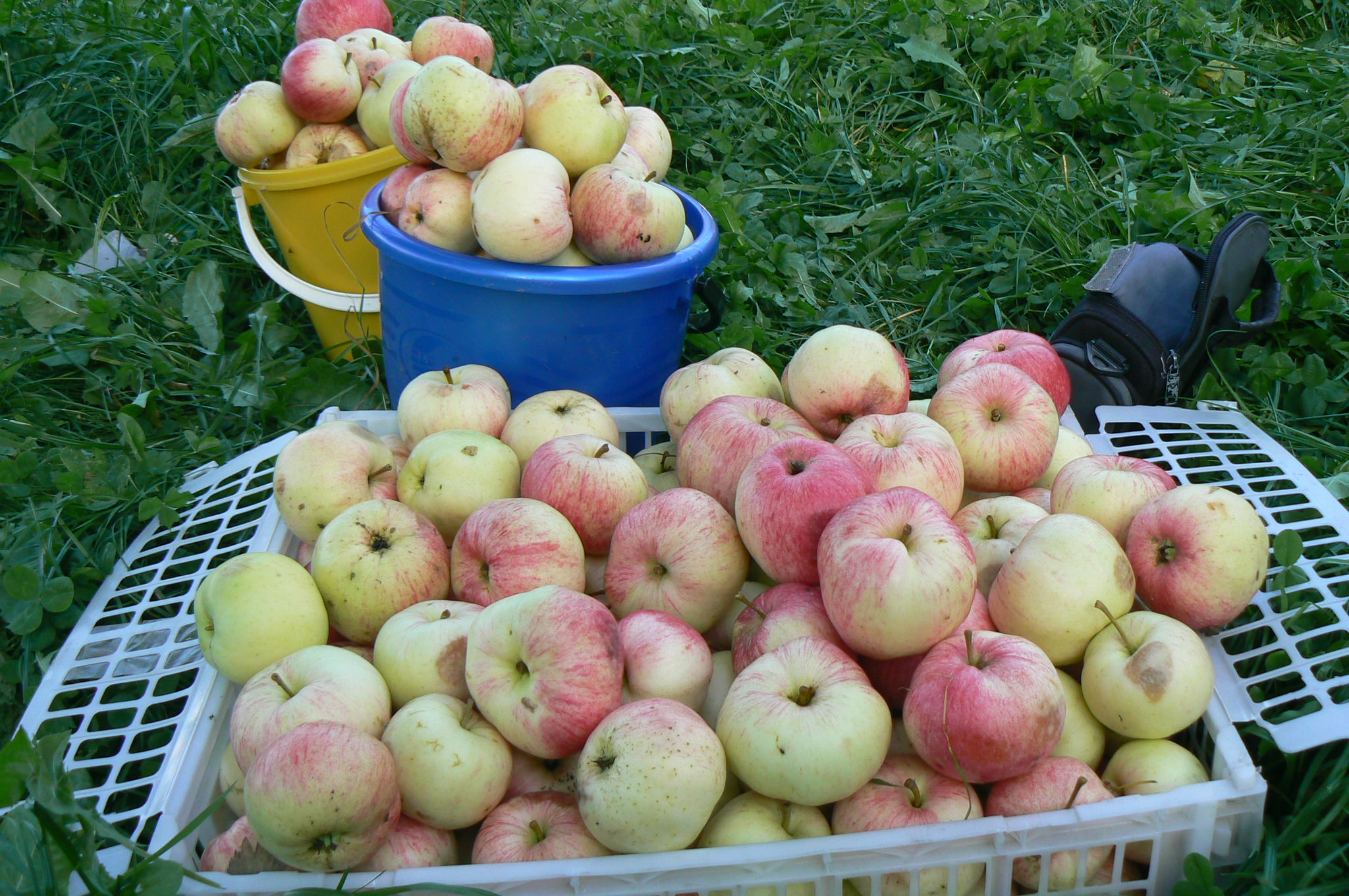 Где оно висело, я не знаю. Это из упавших. Мы не собирали еще яблоки с дерева. Несколько штук висят. Они крупнее и красивее упавших. Красивее не в смысле яркости окраса.