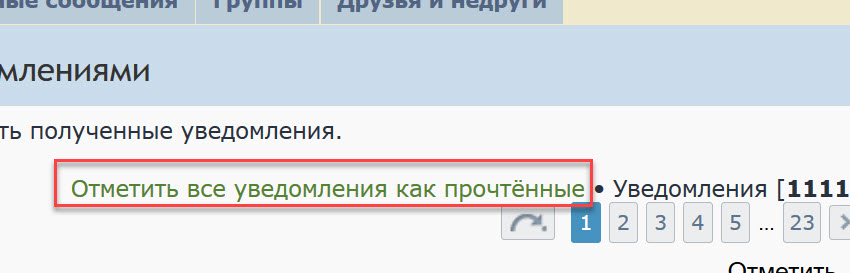 На верху есть кнопочка :"непрочитанные сообщения" нажимаешь и там выбираешь "отметить как все прочтенное"