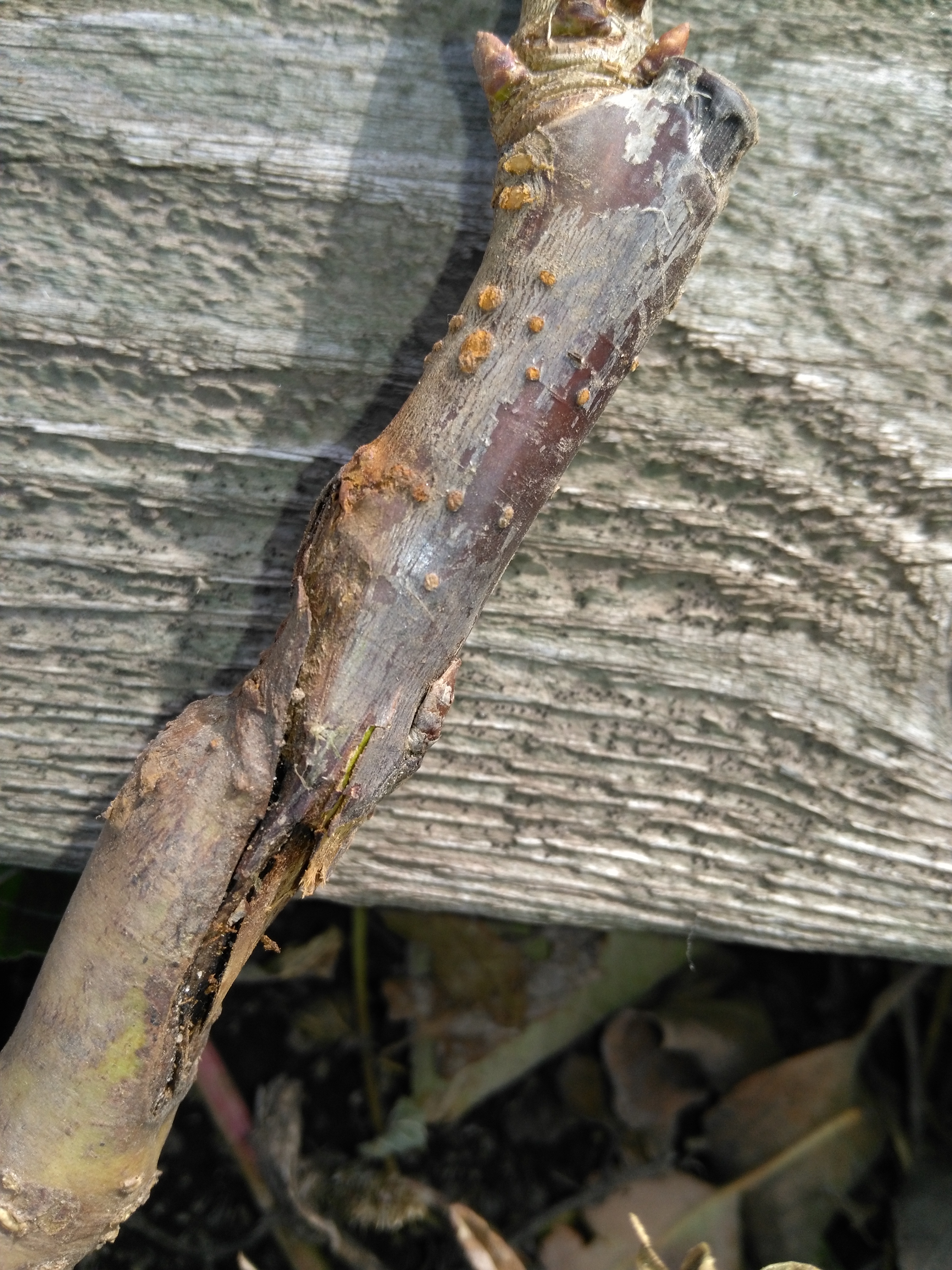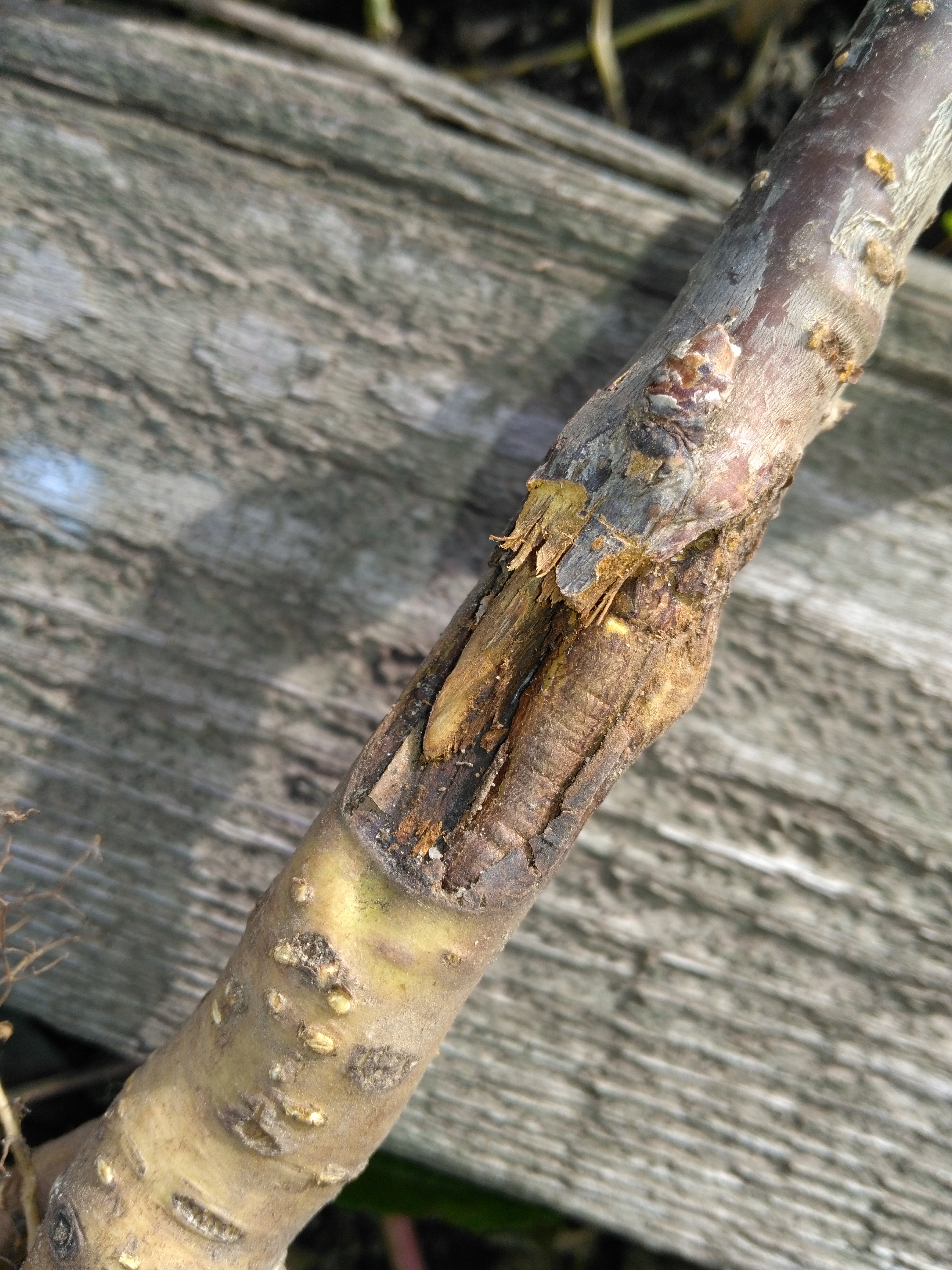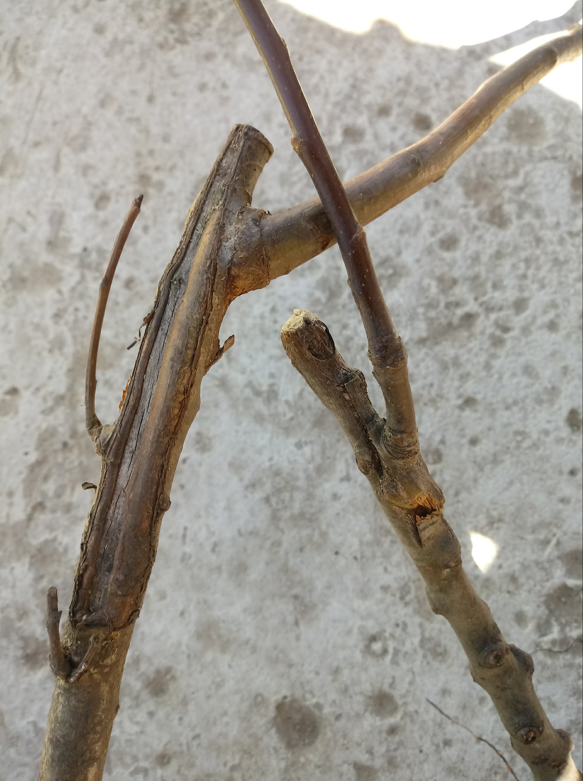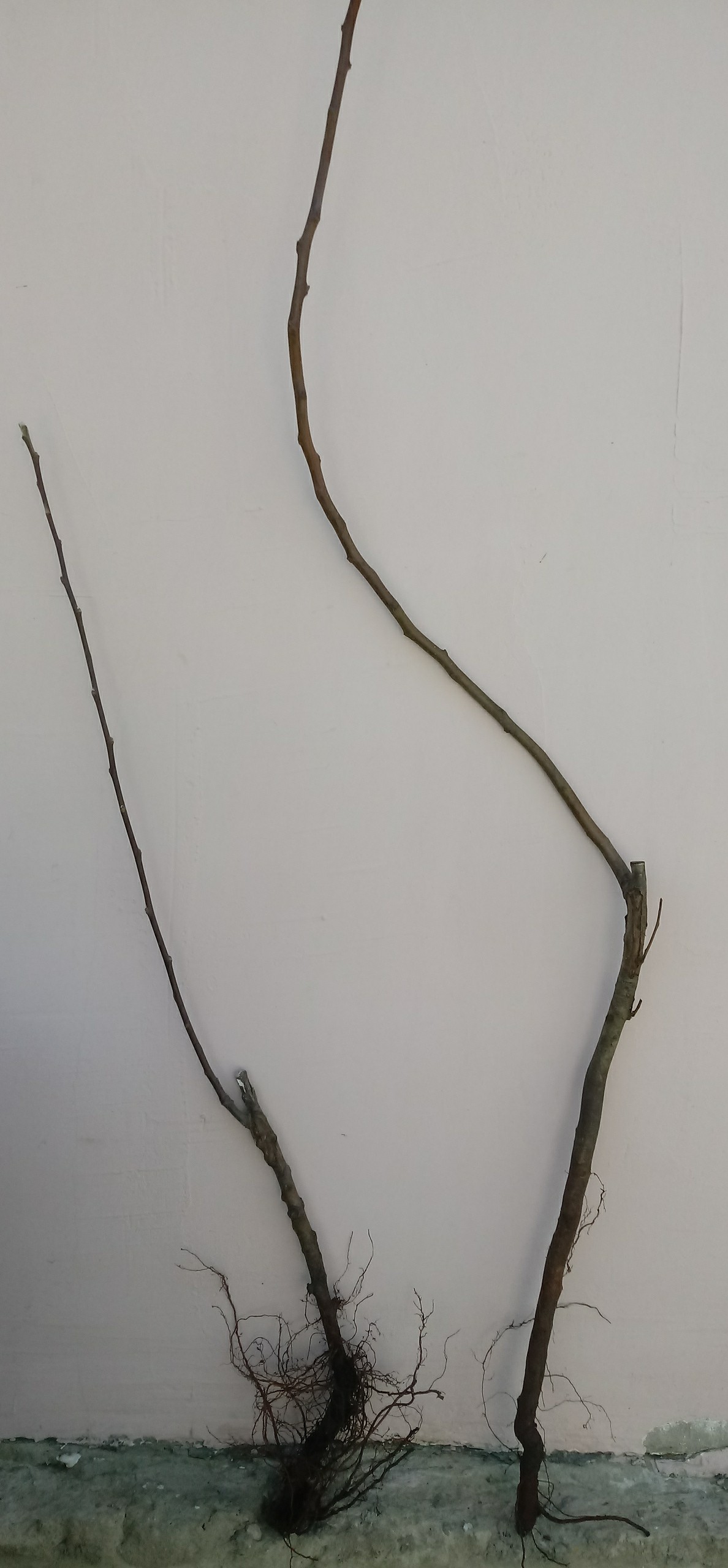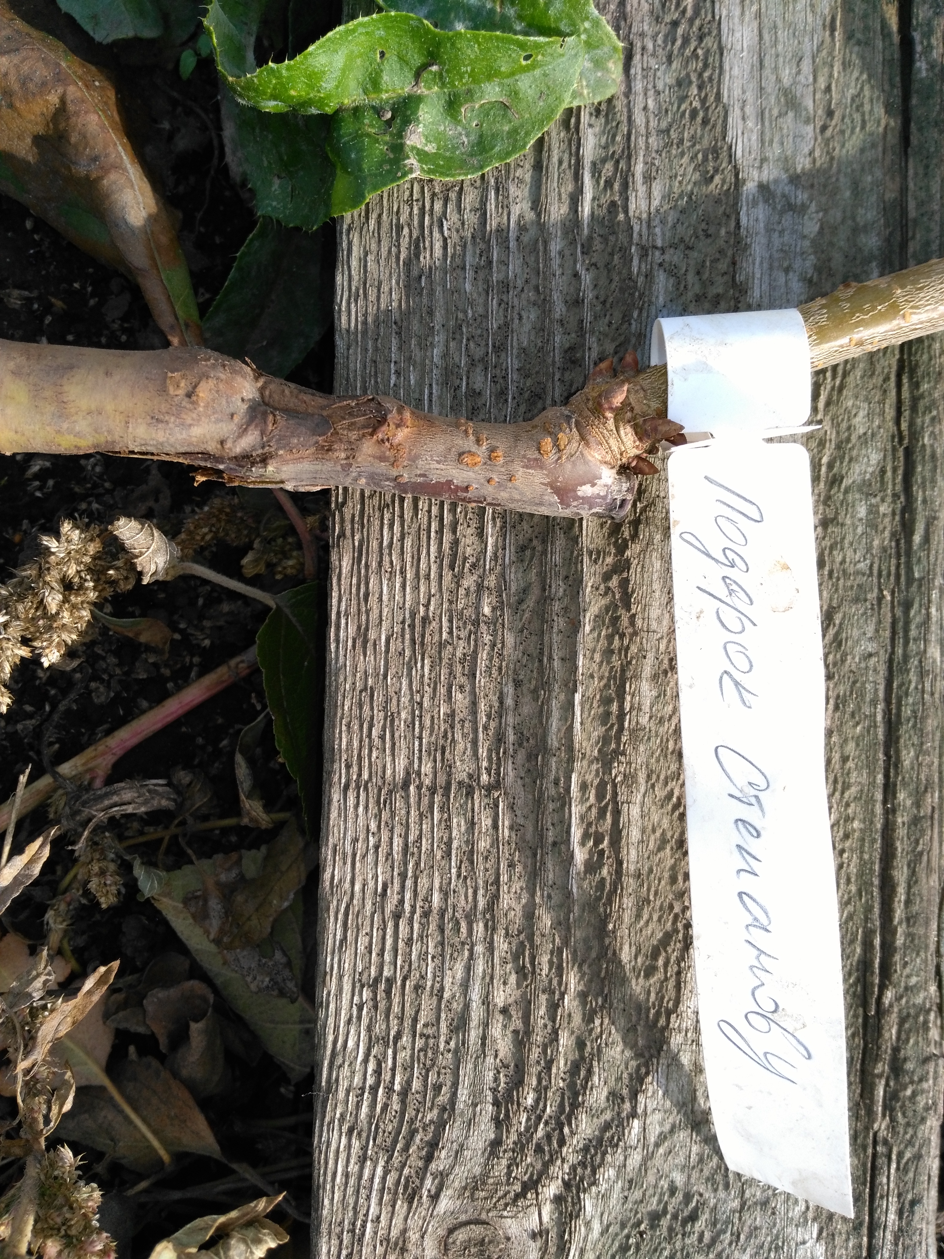 Этот саженец достался знакомой, у нее участок в более теплом месте, чем наша дача. Я не рискую сажать не районированное. Оказалось, две тонкие веточки - это и есть прививка.